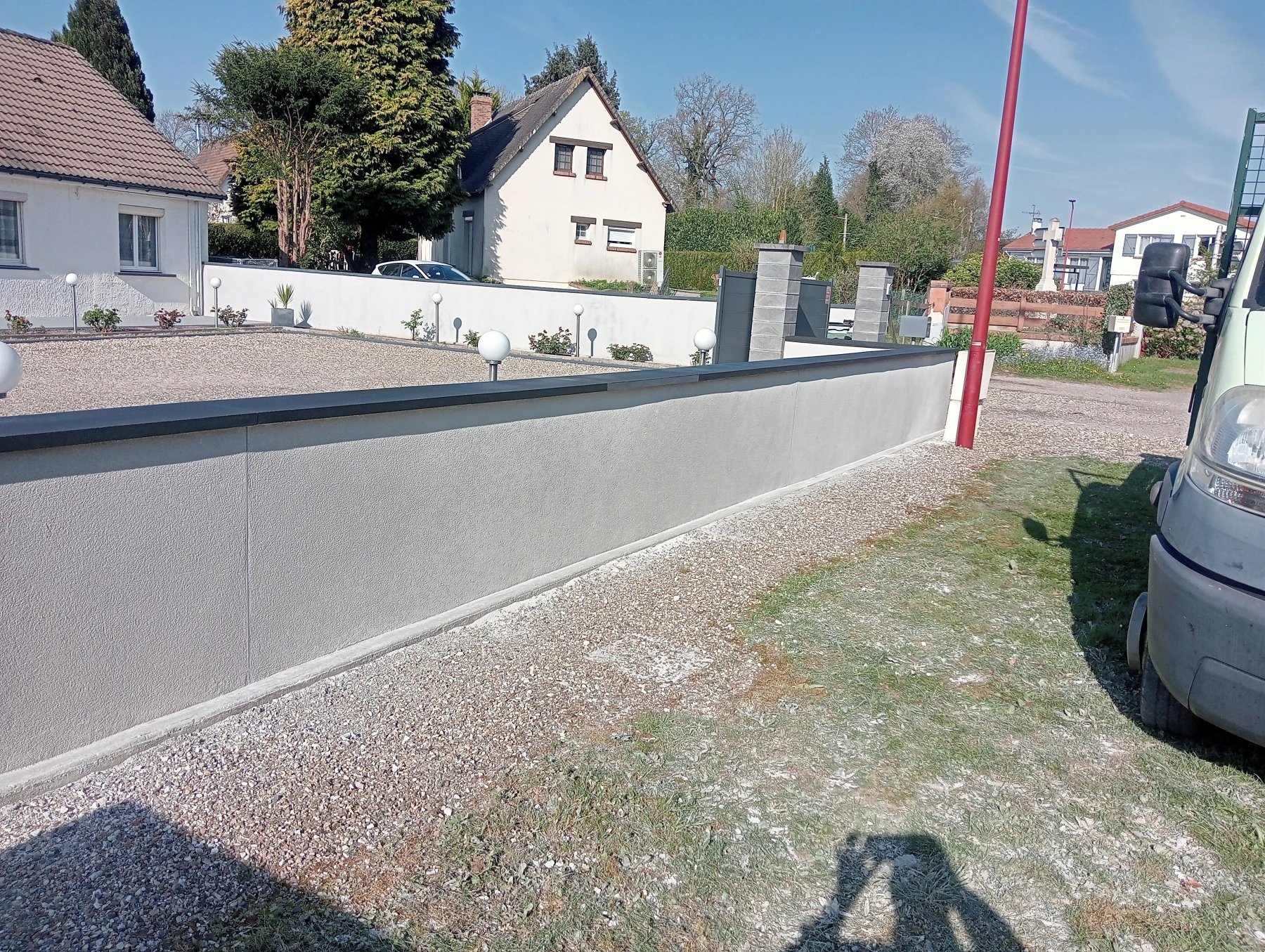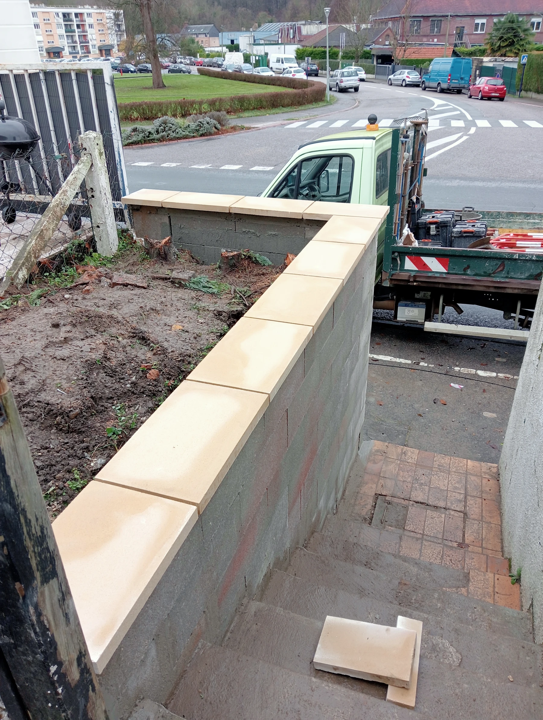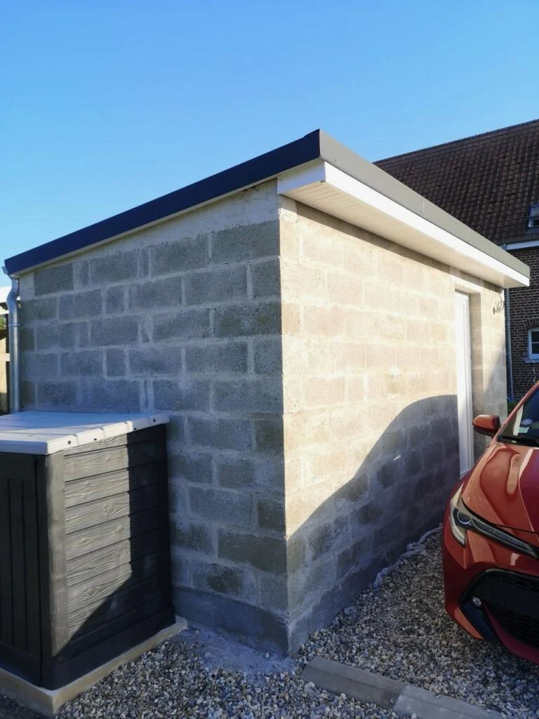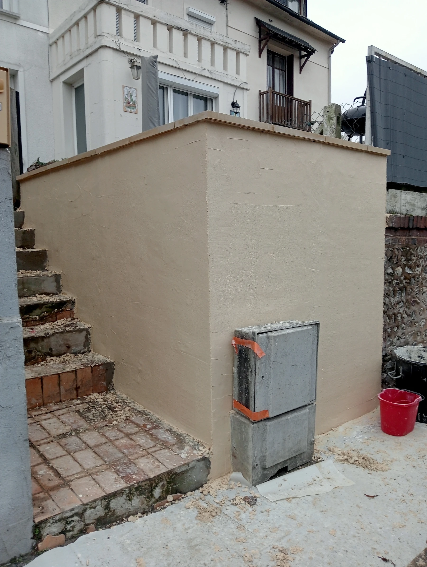 Travaux de maçonnerie avec pose de couvre mur plat aux dessus avec finition enduit gratté gris clair