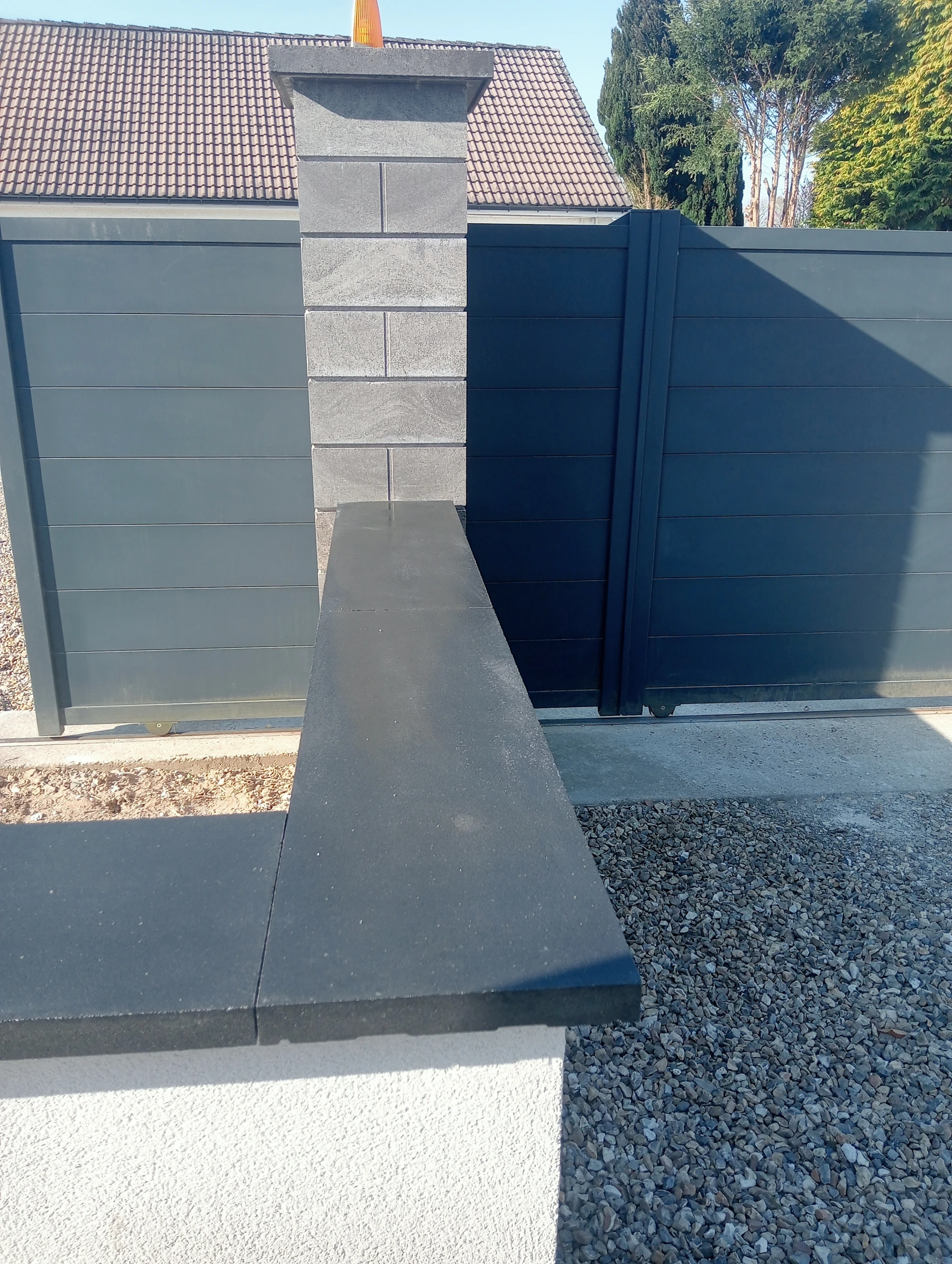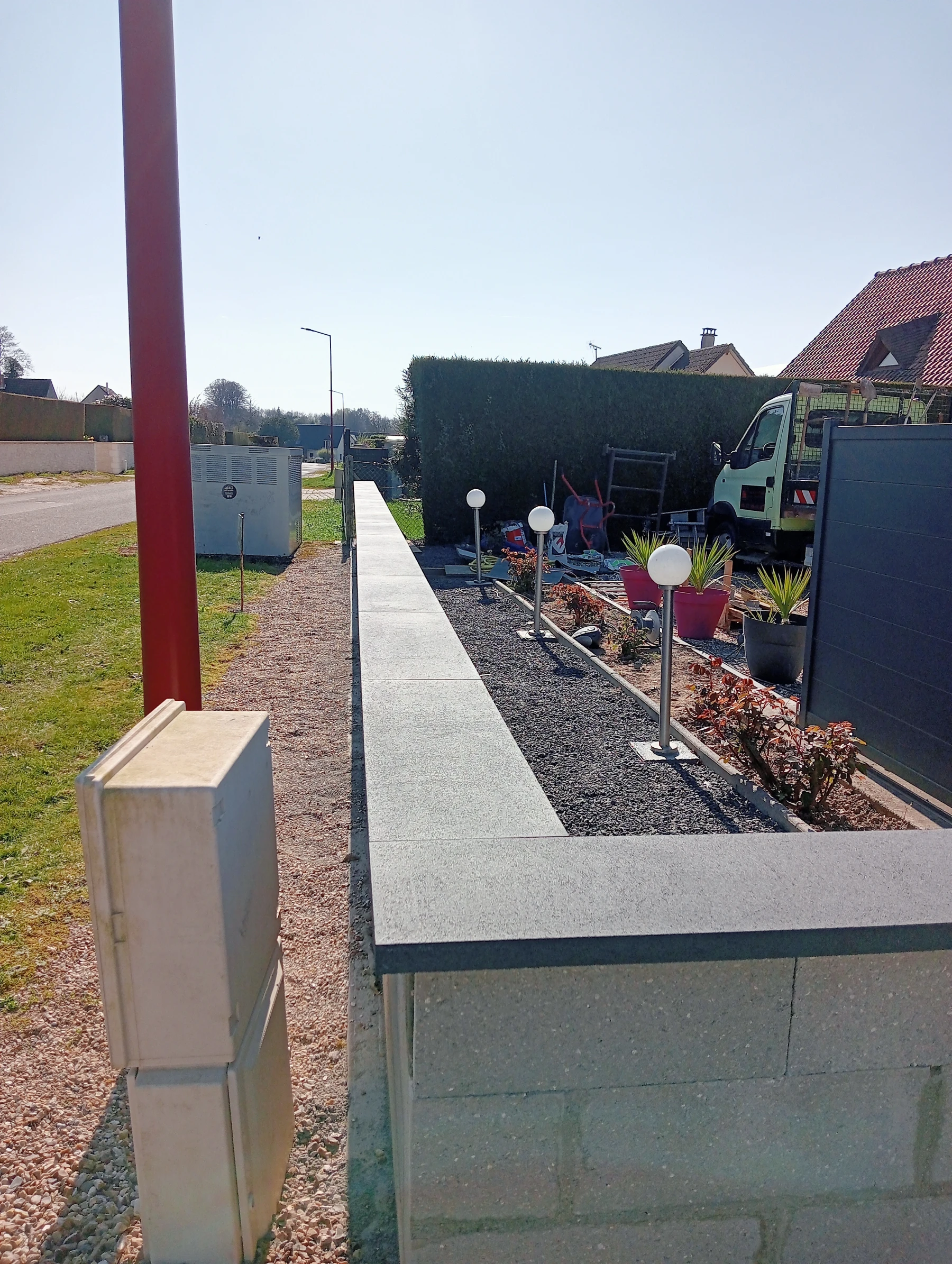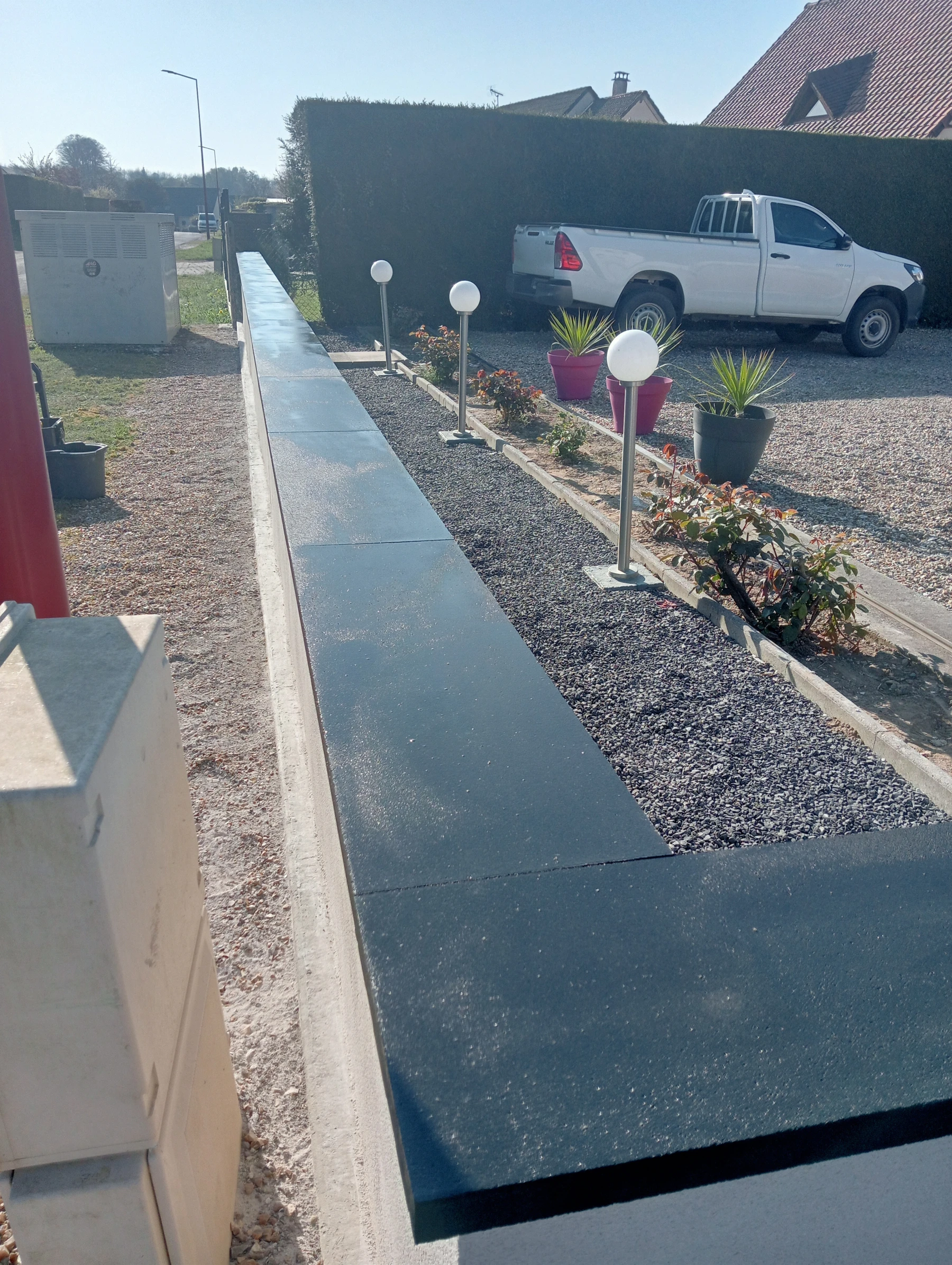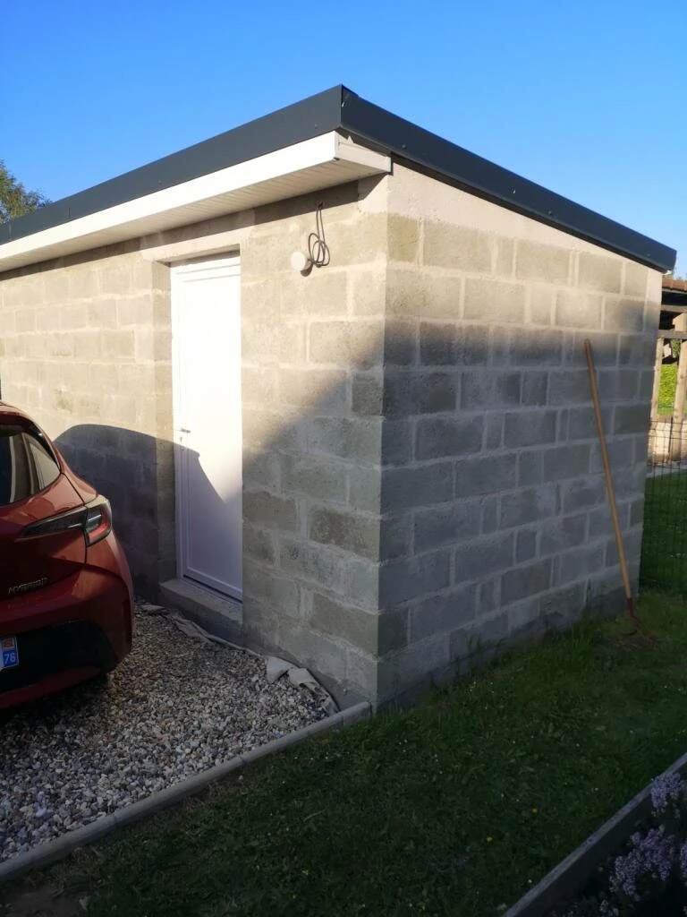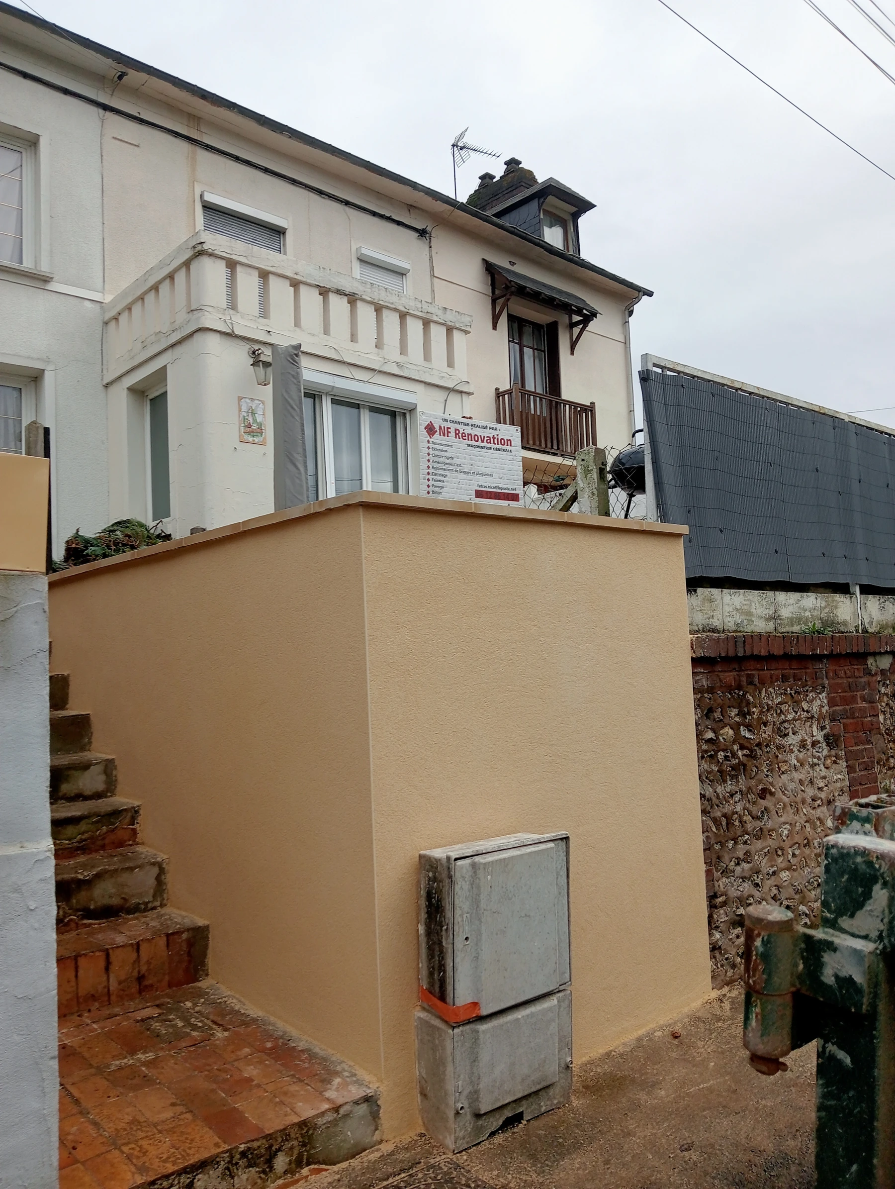 Travaux de maçonnerie avec pose de couvre mur plat aux dessus avec finition enduit gratté gris clair