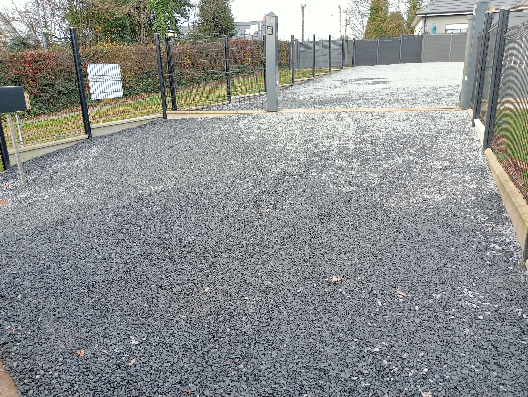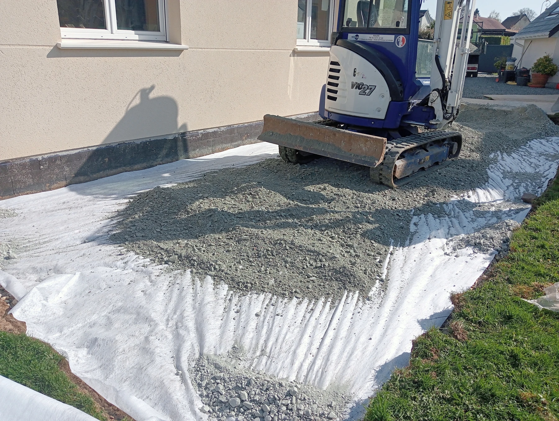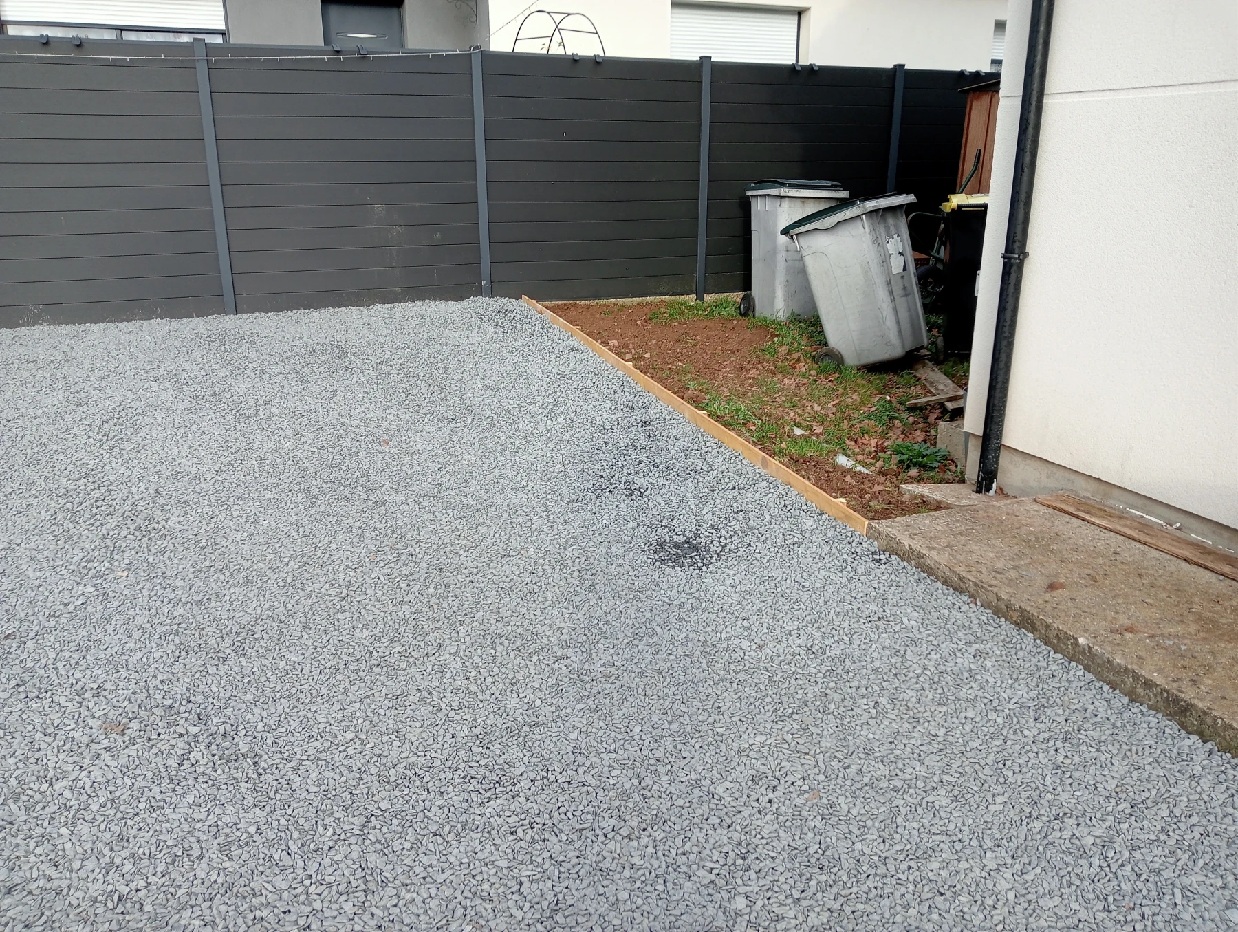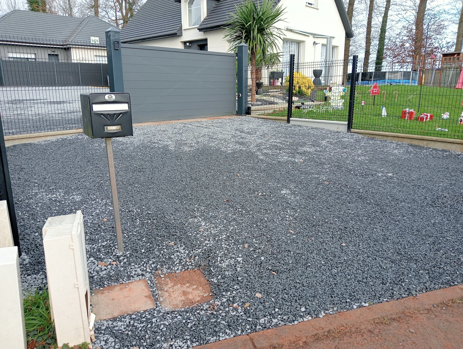 Travaux d'aménagement en gravier gris bleu chantier à Anceaumeville 76
