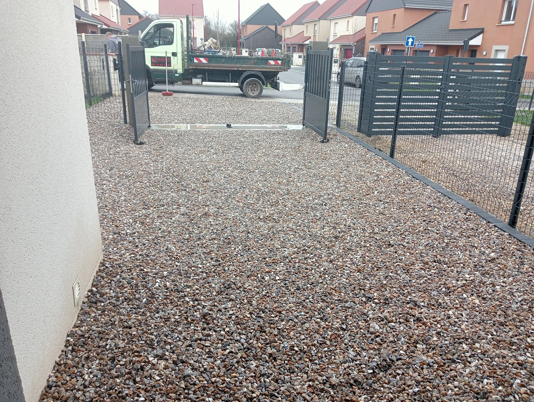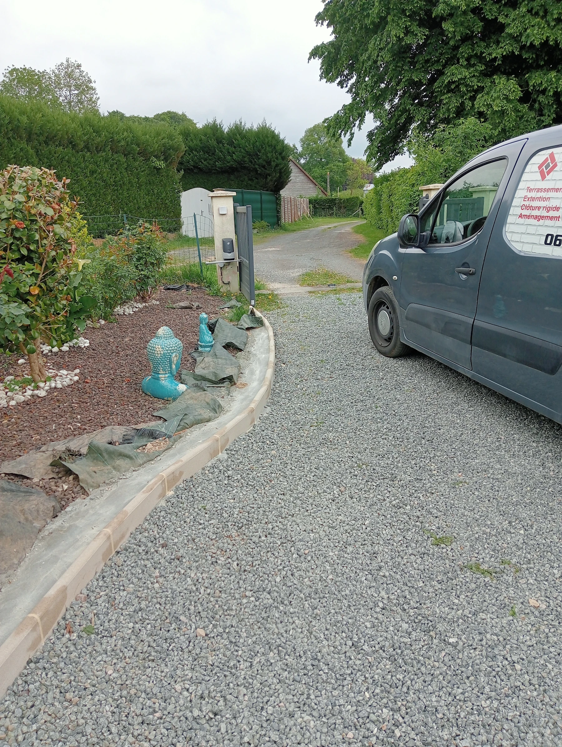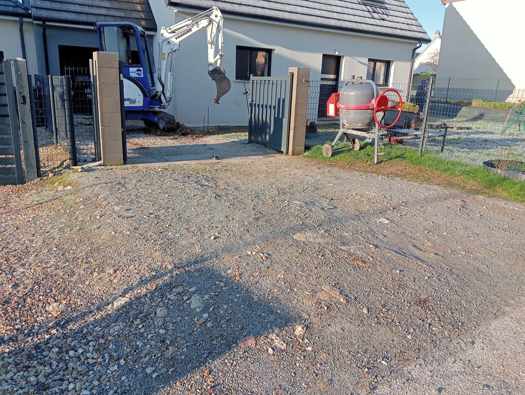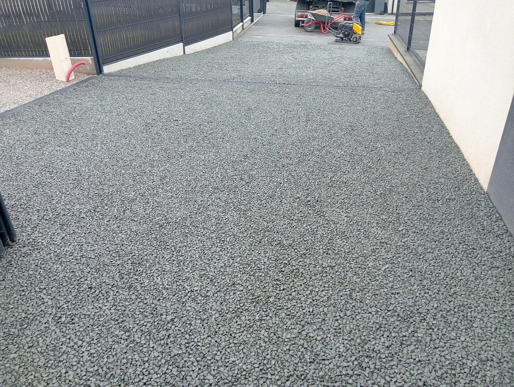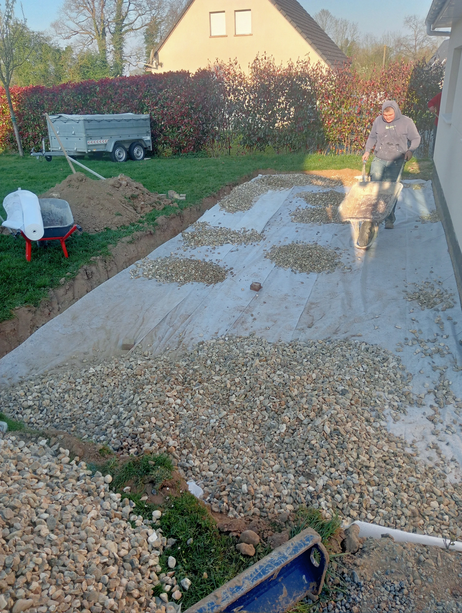 Travaux d'aménagement en gravier gris bleu chantier à Anceaumeville 76