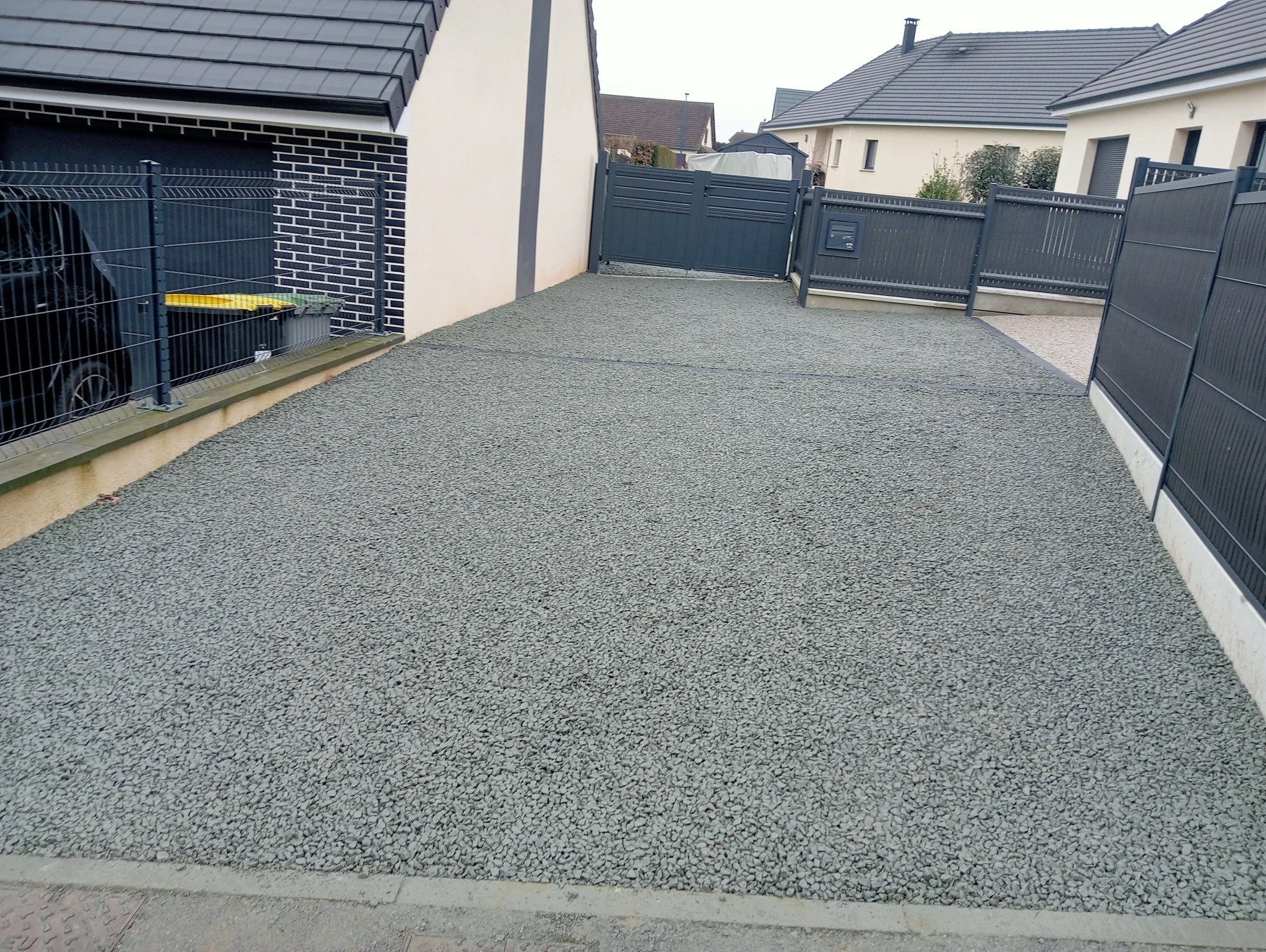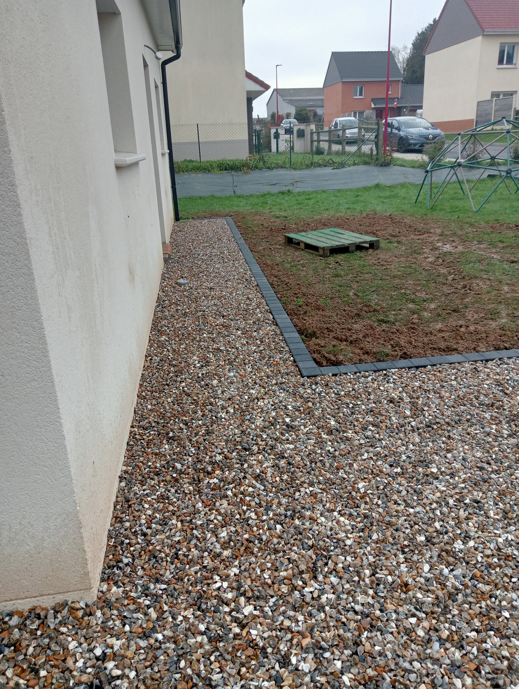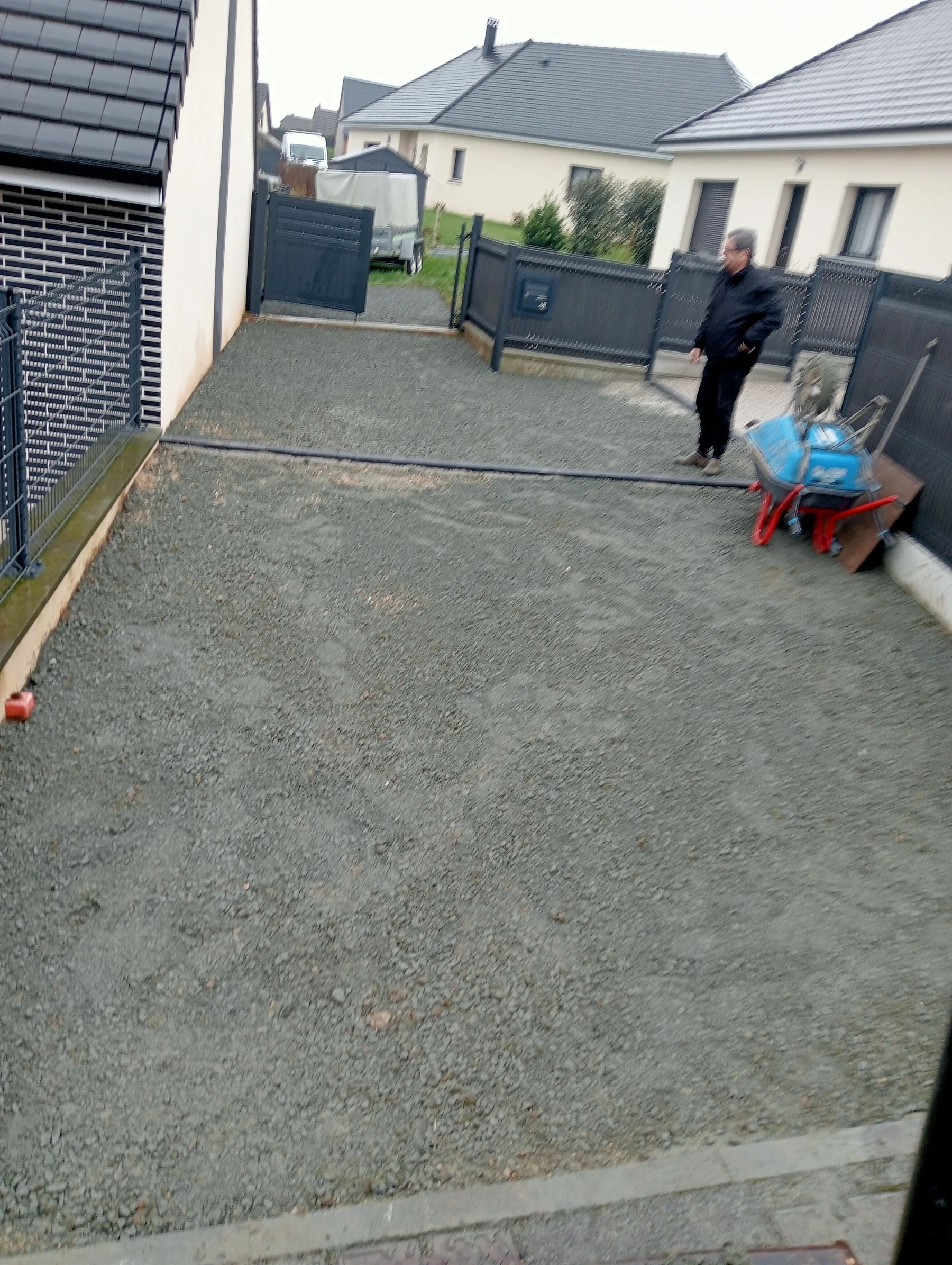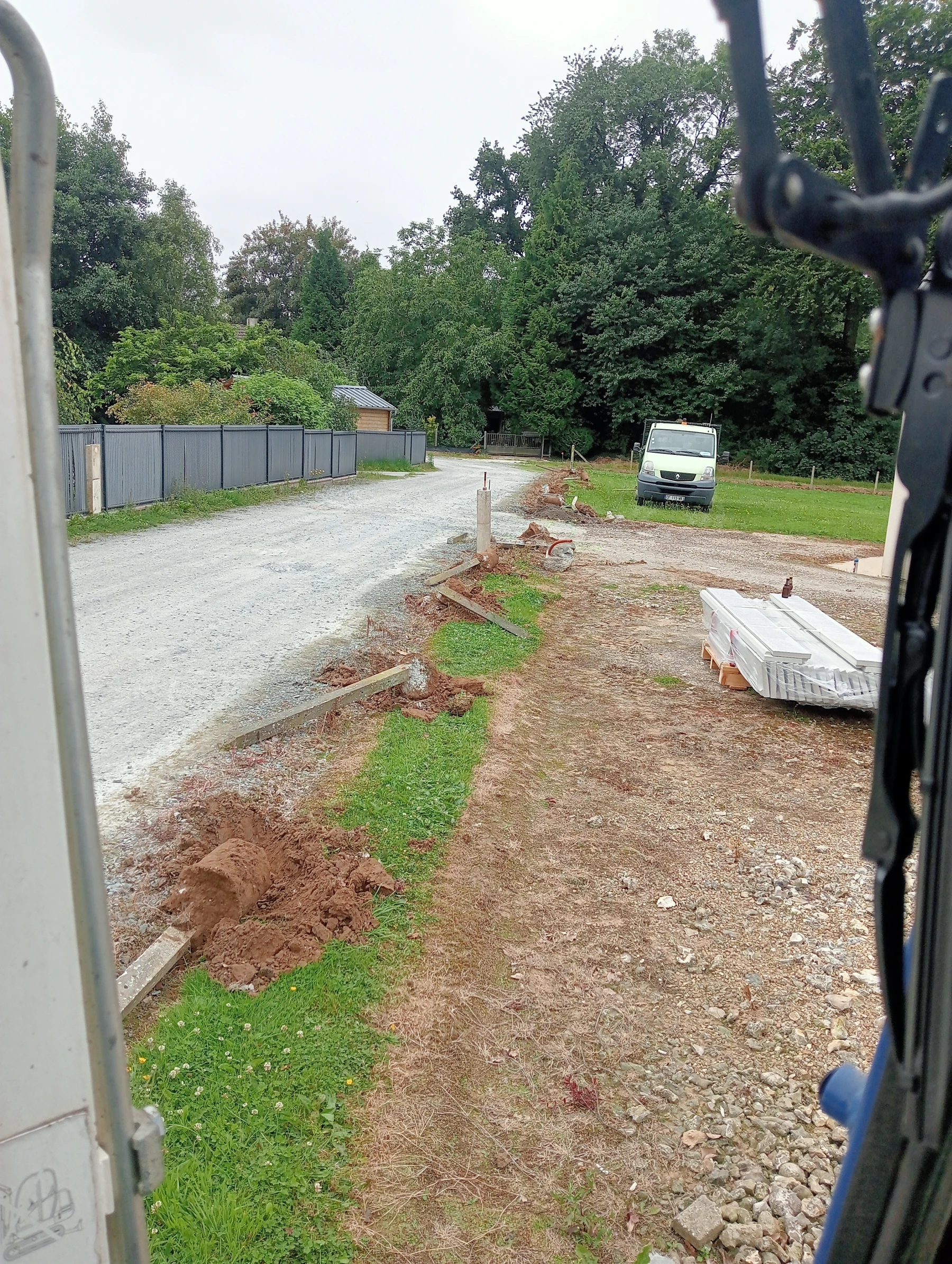 Travaux d'aménagement en gravier gris bleu chantier à Anceaumeville 76