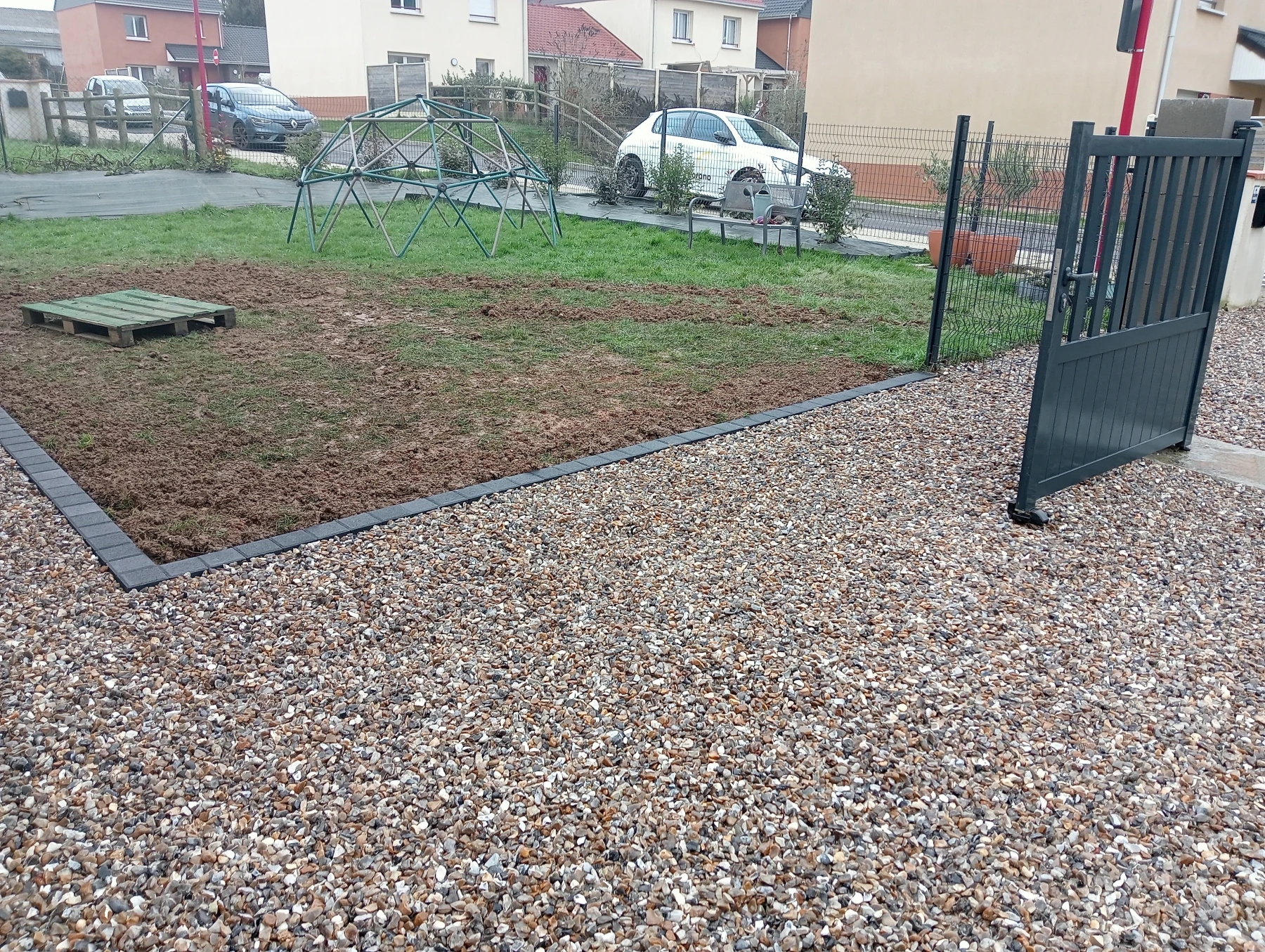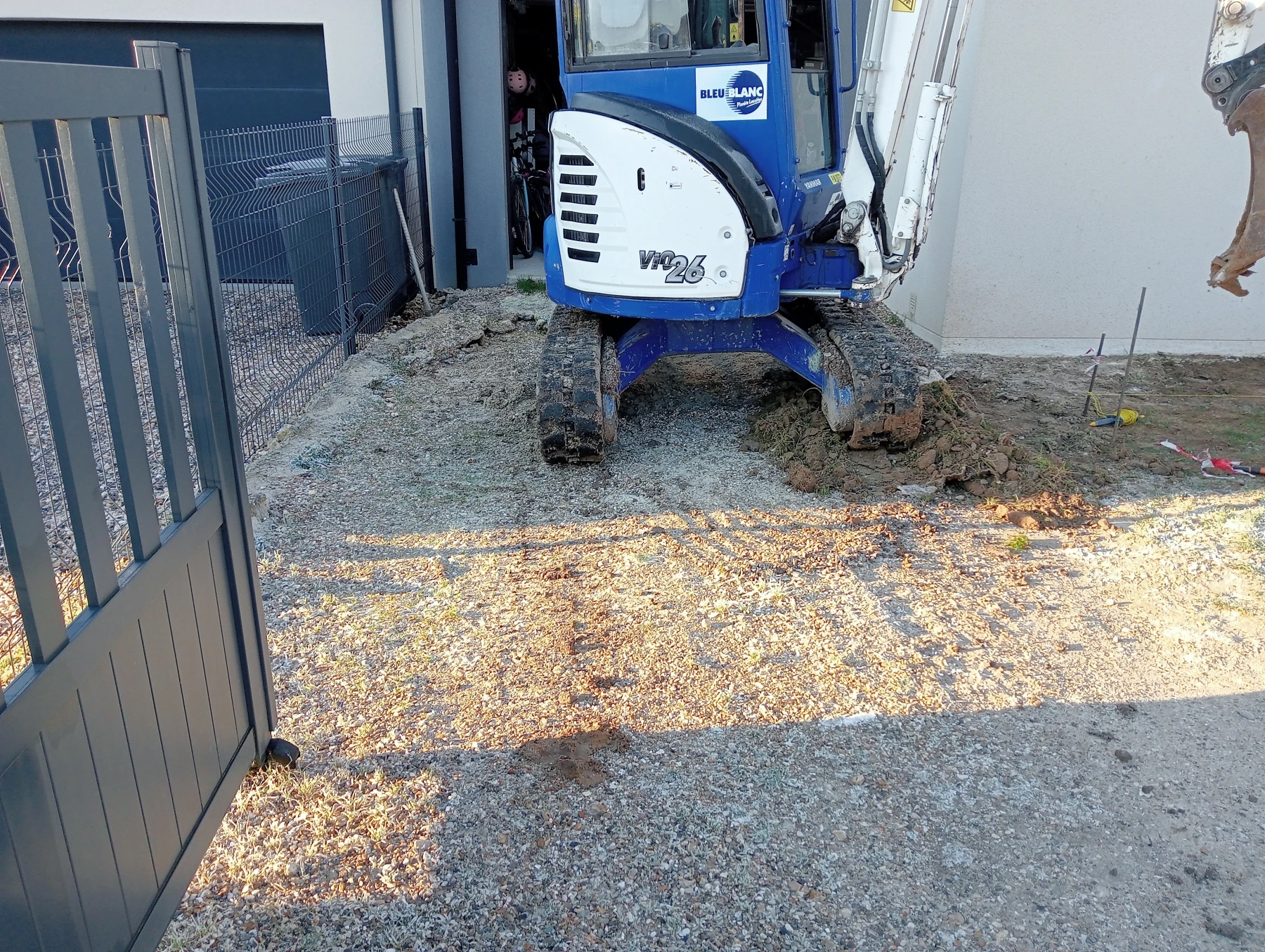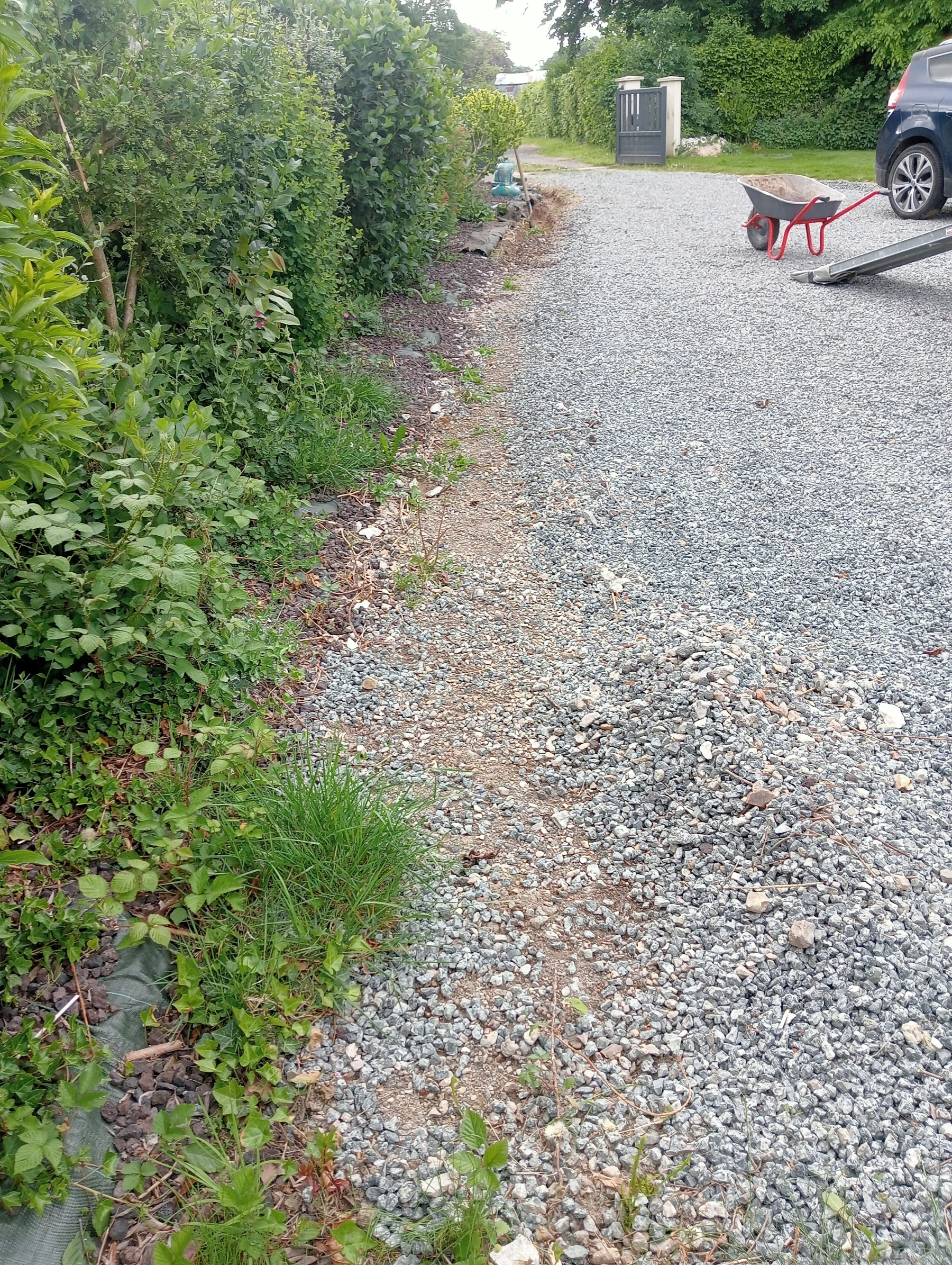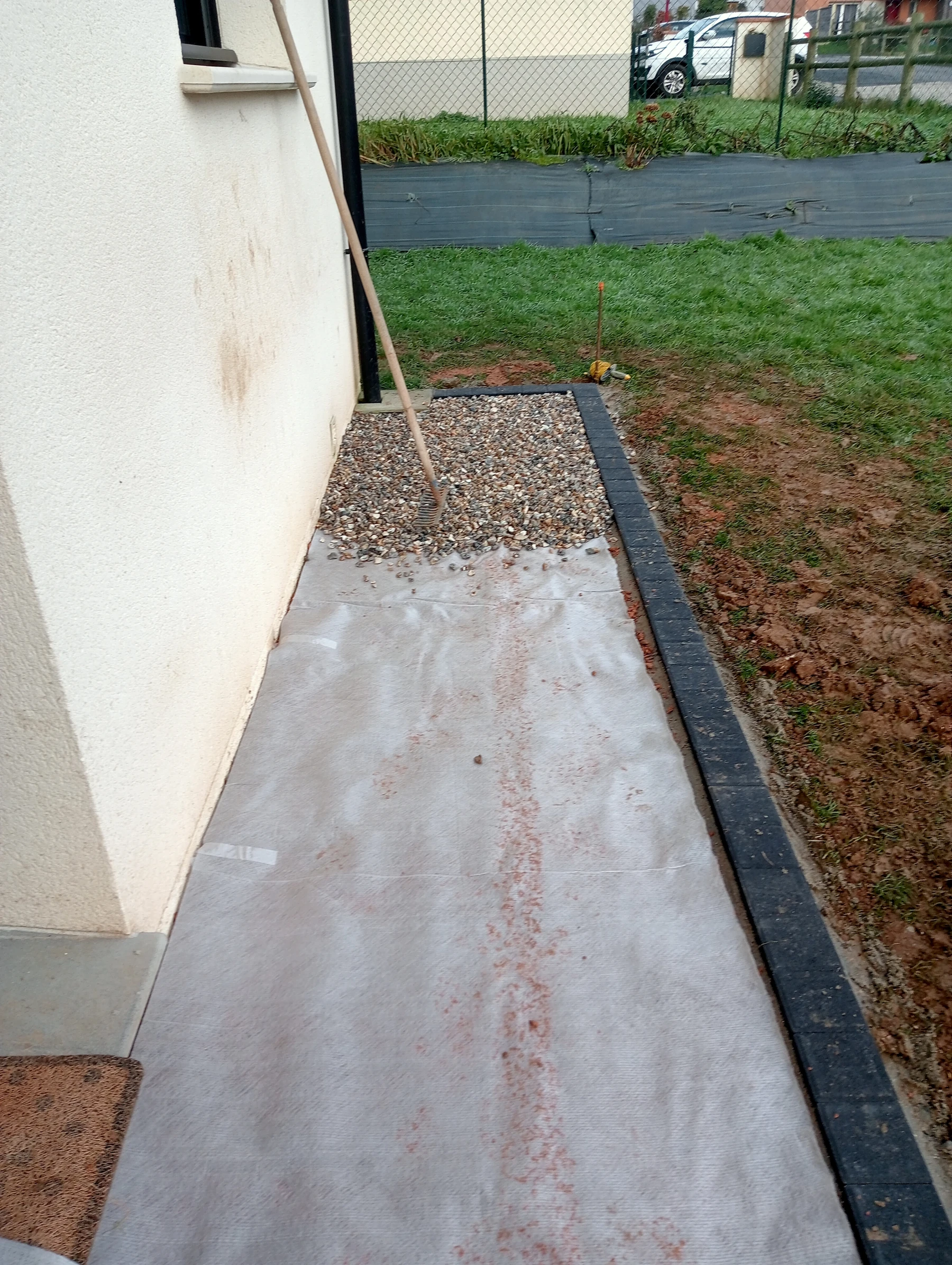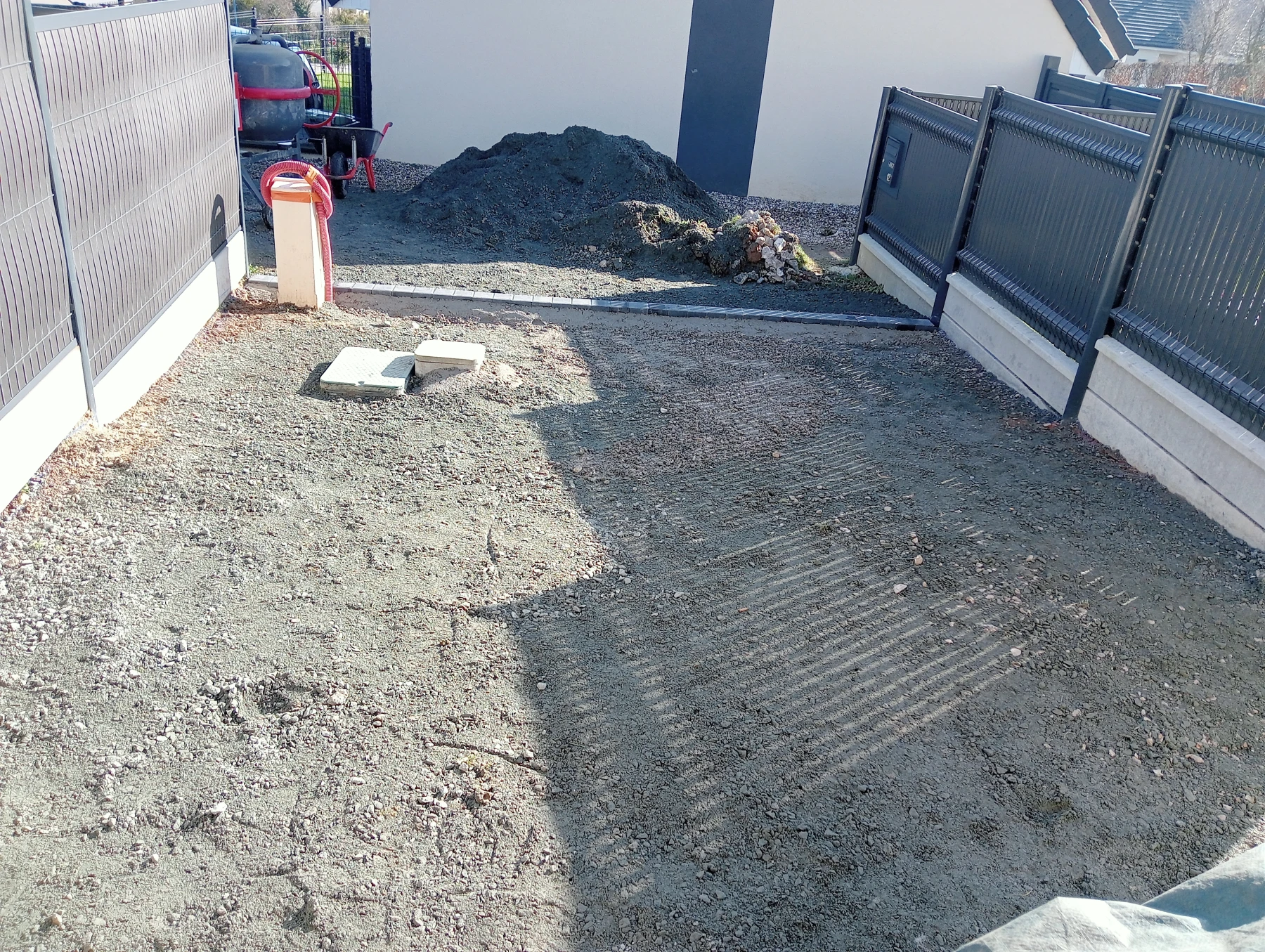 Travaux d'aménagement en gravier gris bleu chantier à Anceaumeville 76