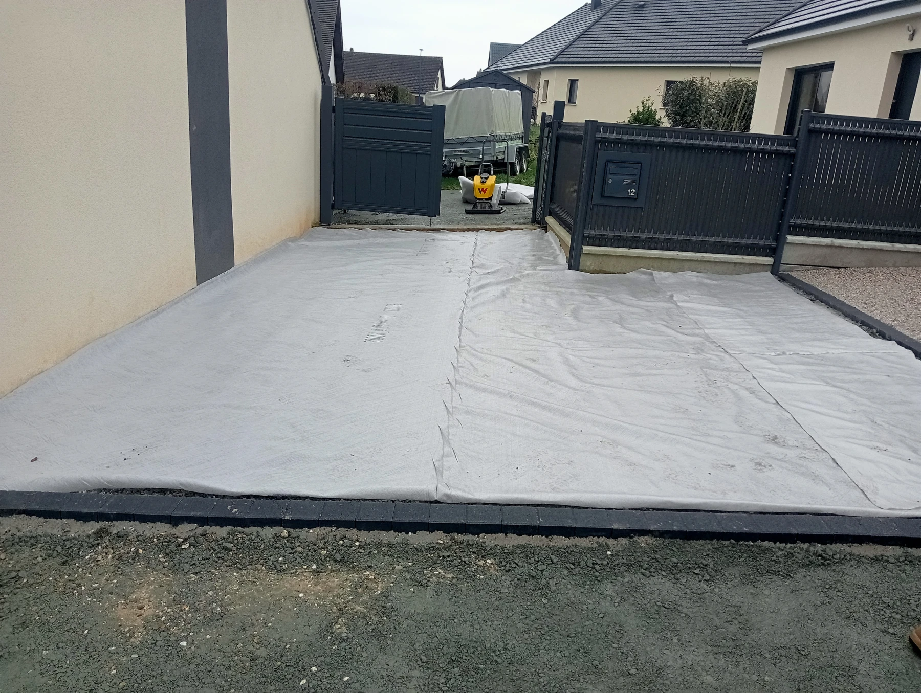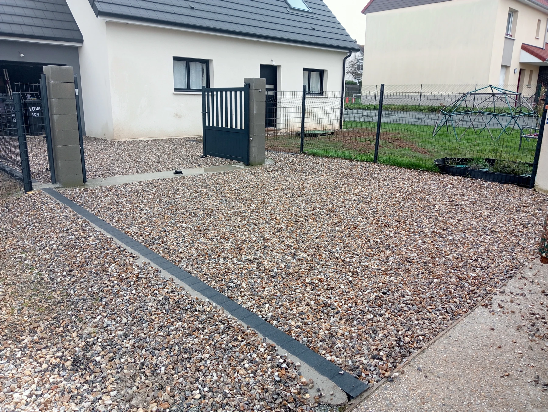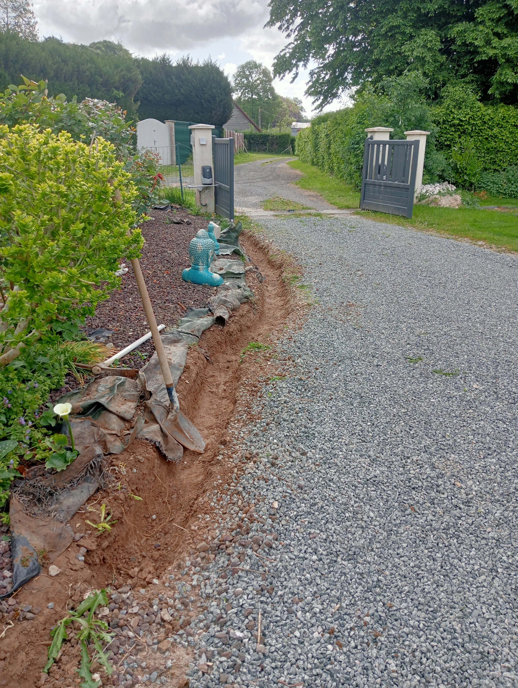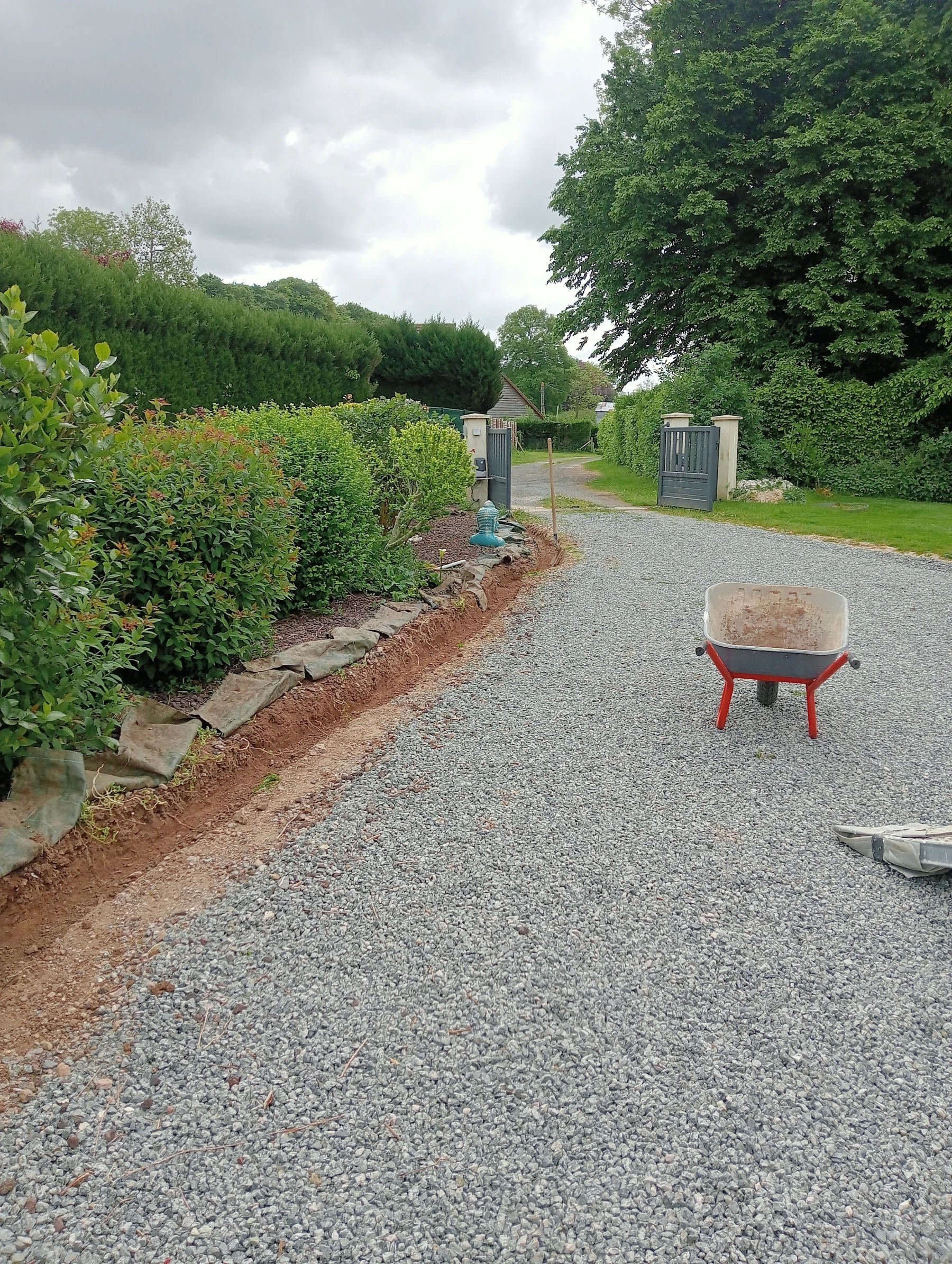 Travaux d'aménagement en gravier gris bleu chantier à Anceaumeville 76