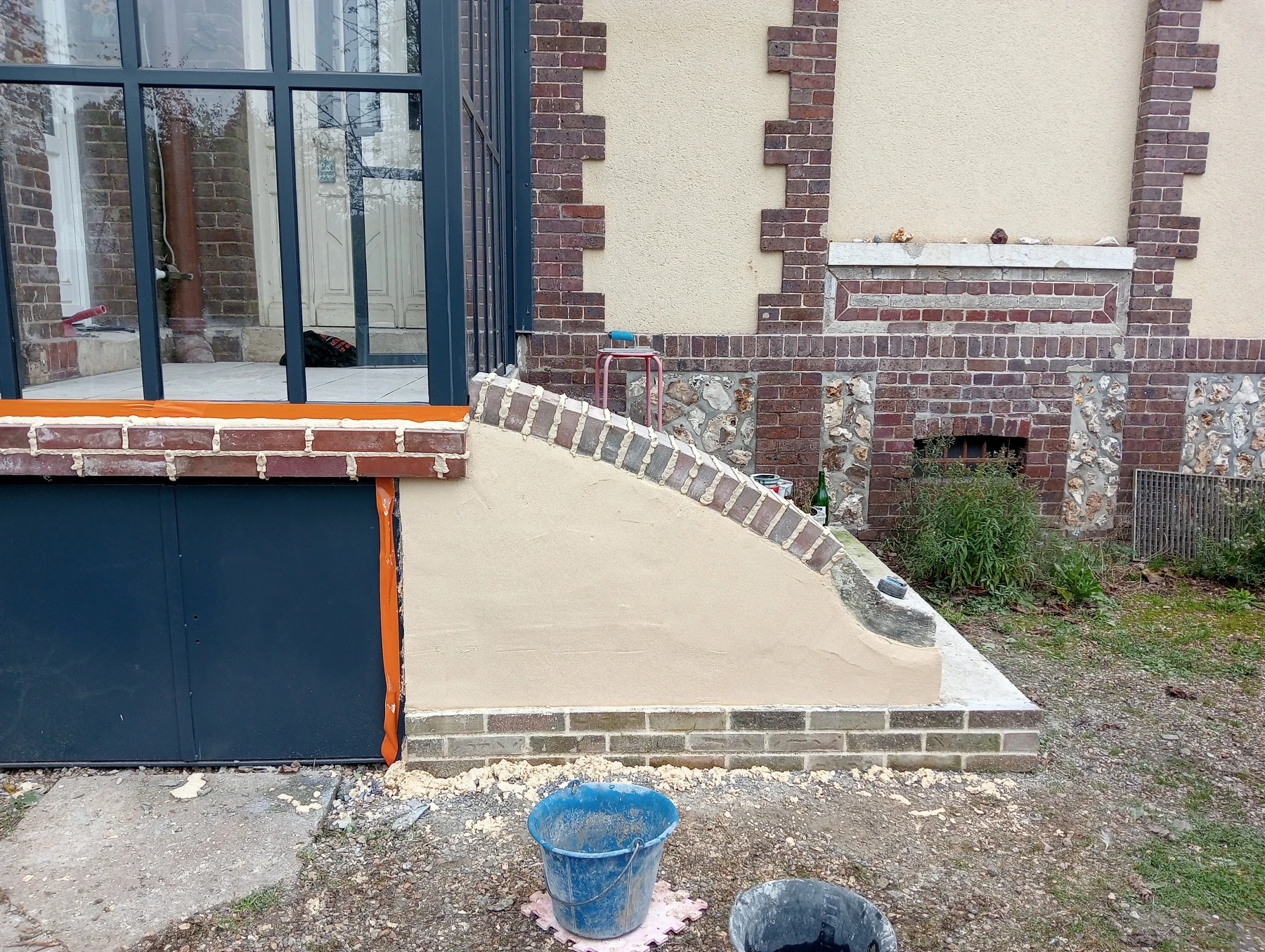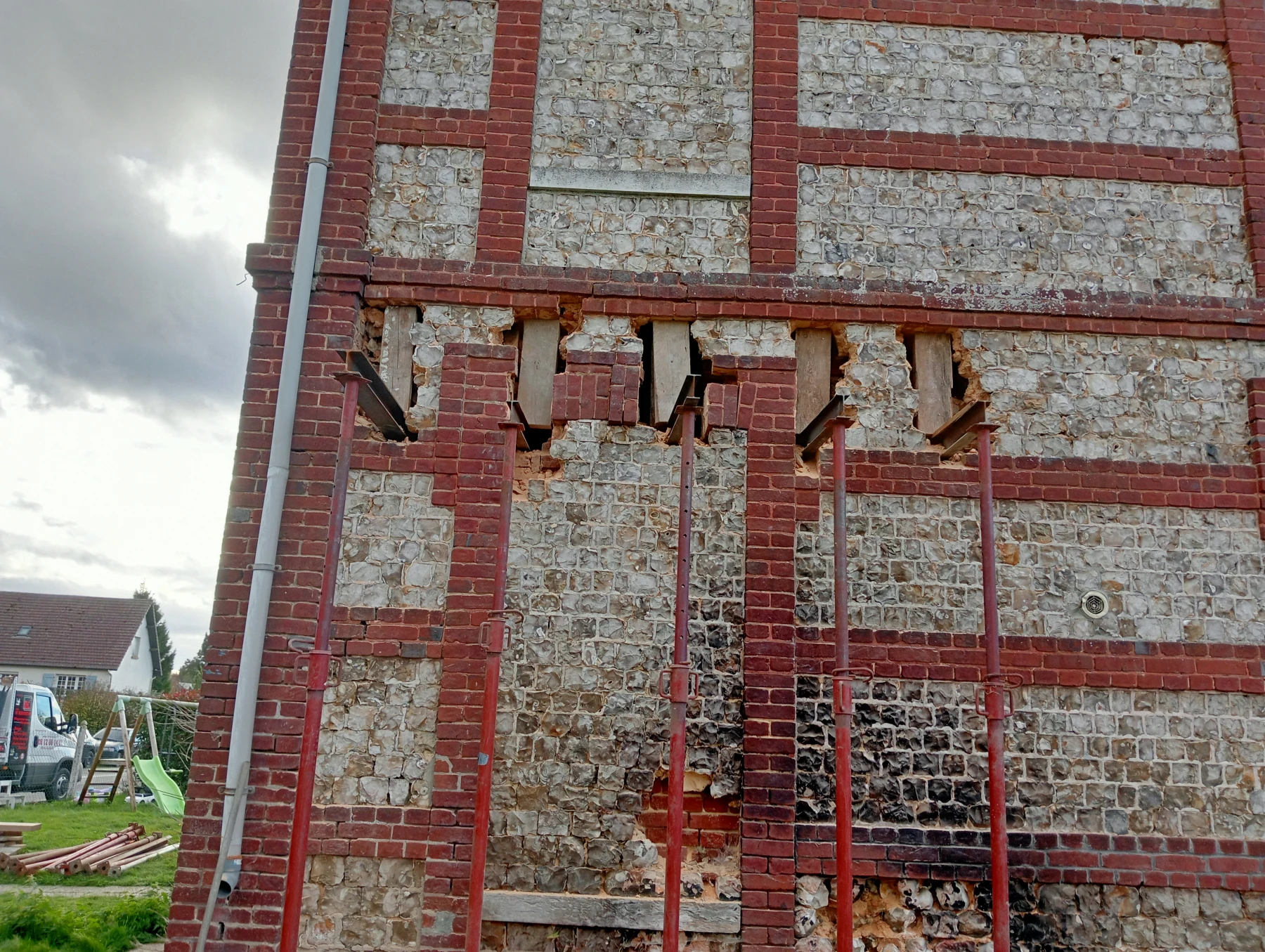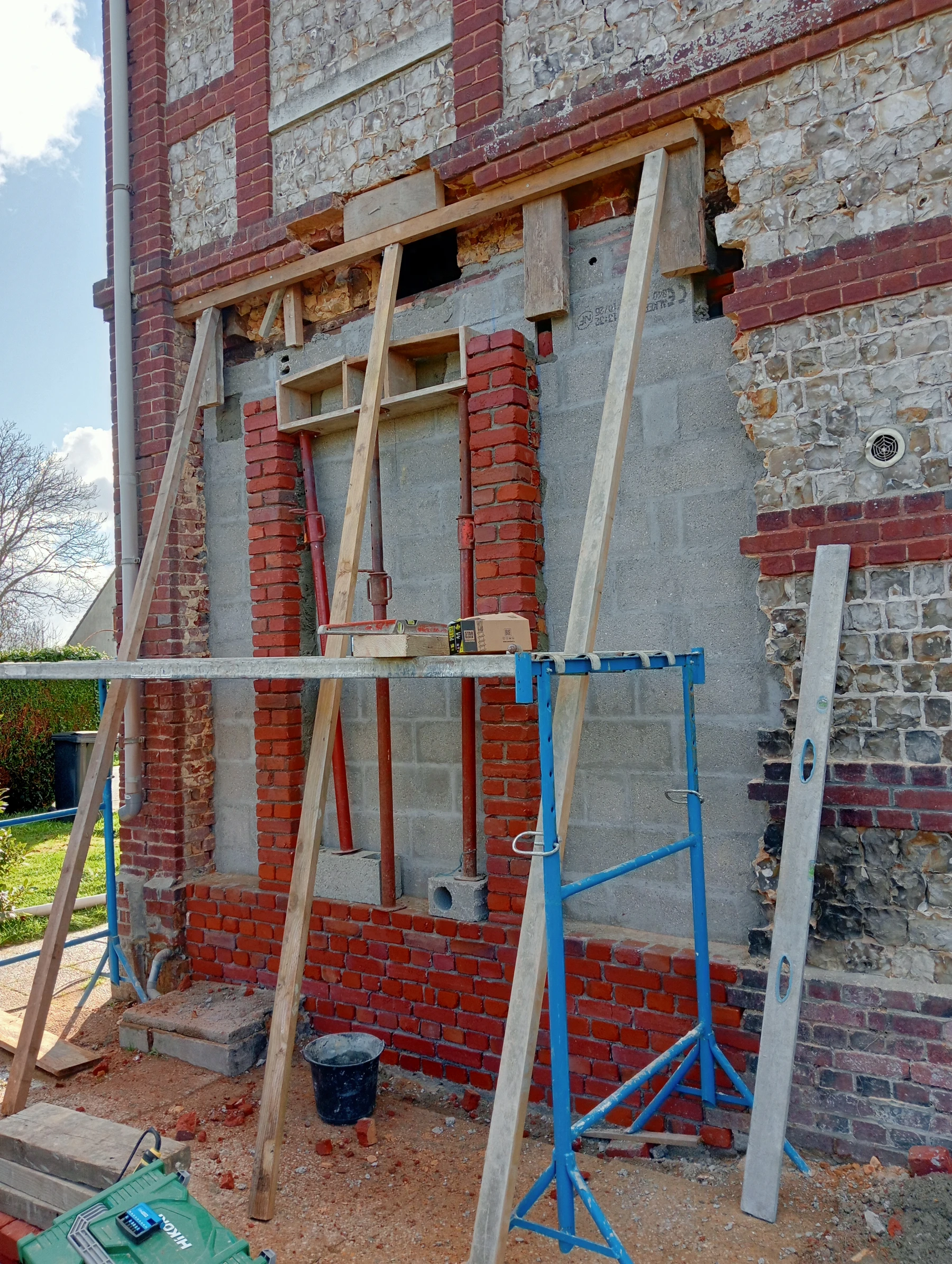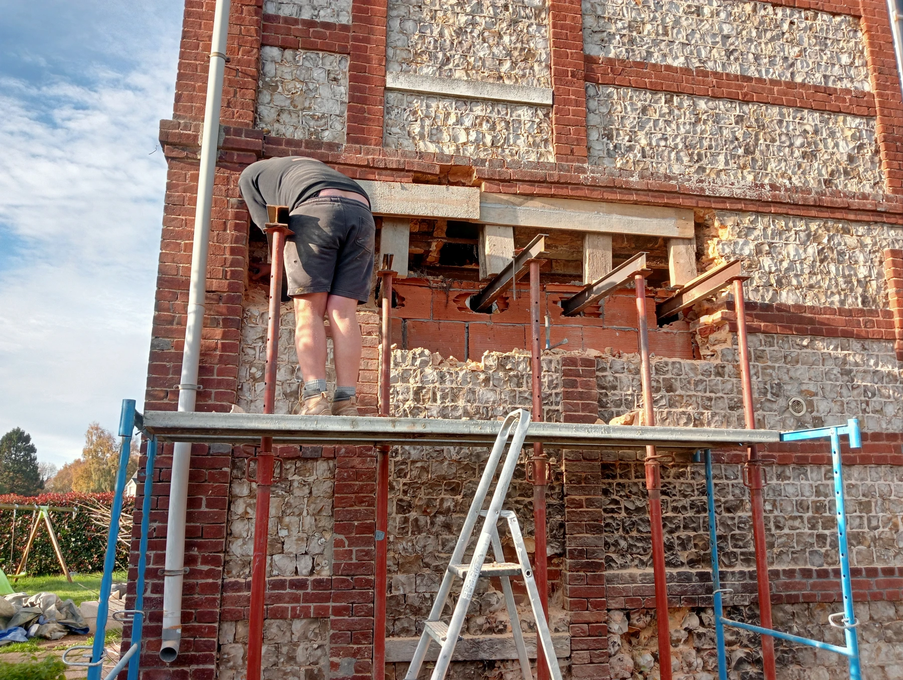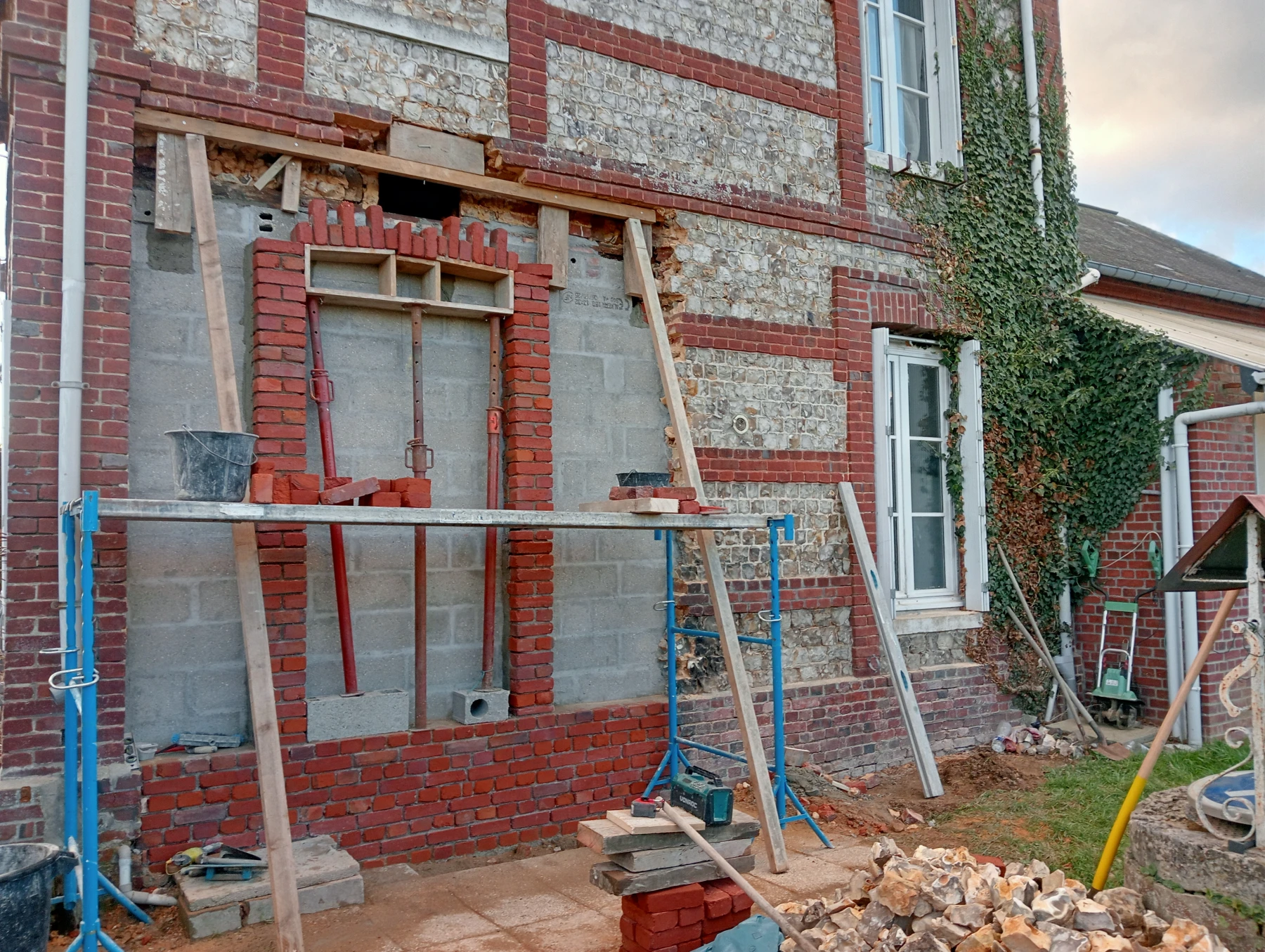 travaux de rénovation sur une façade en brique et silex
