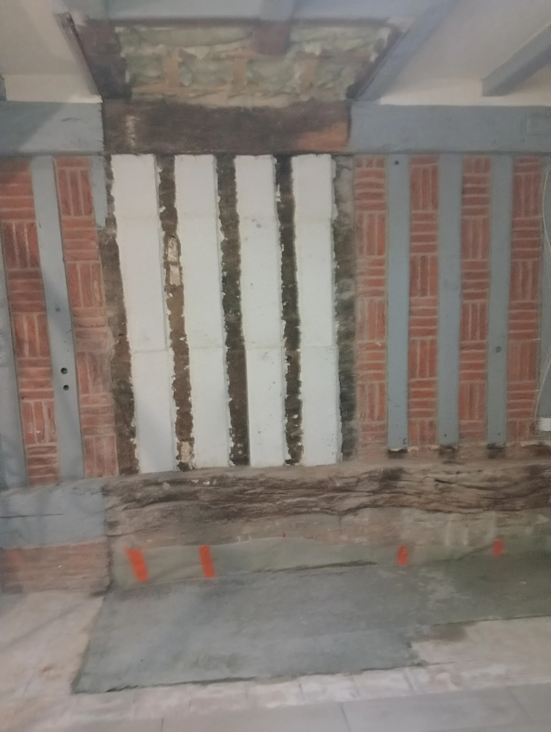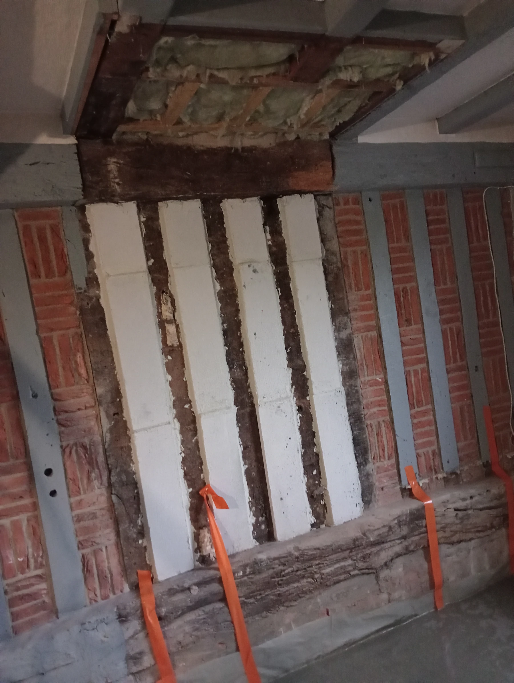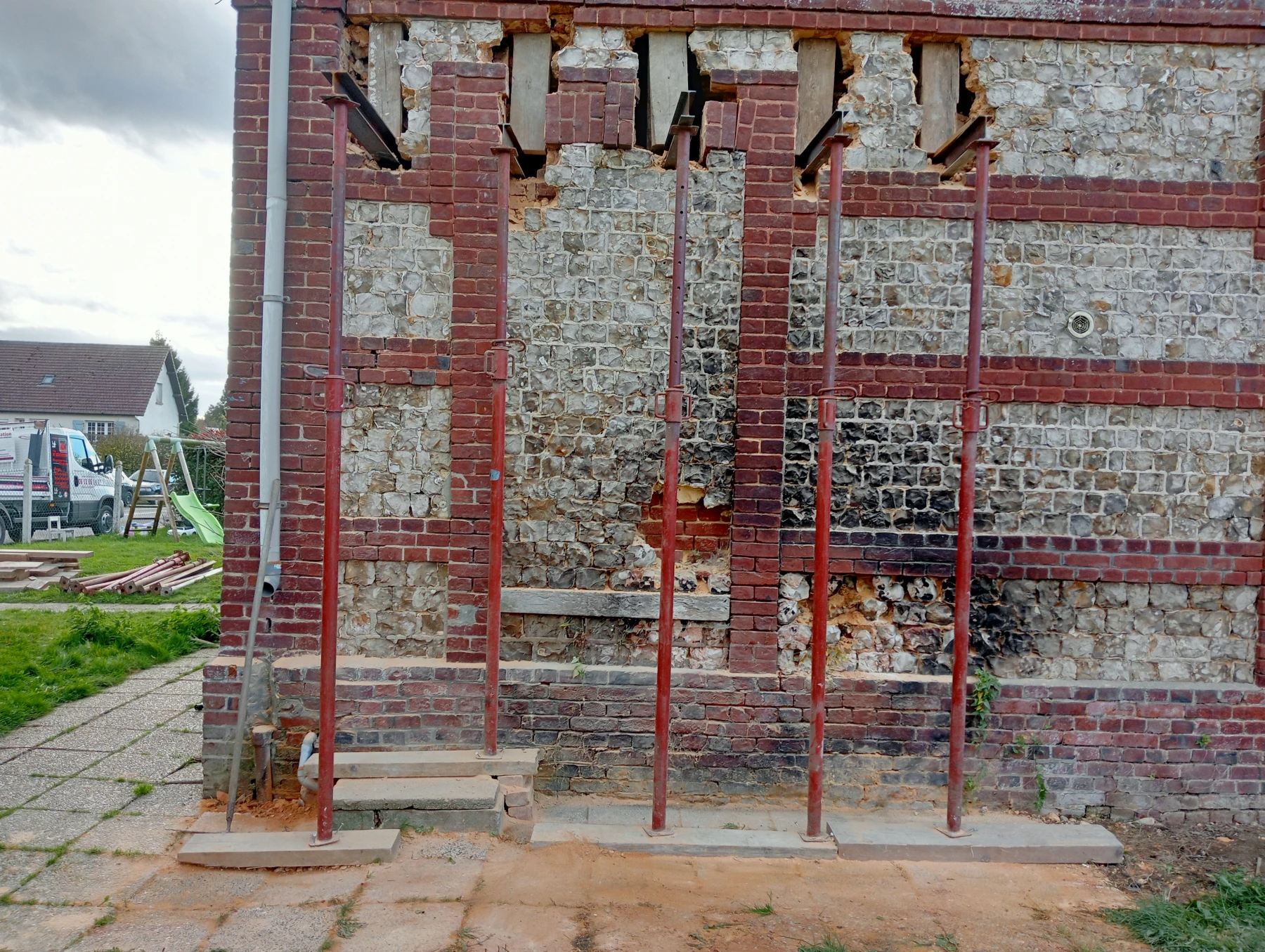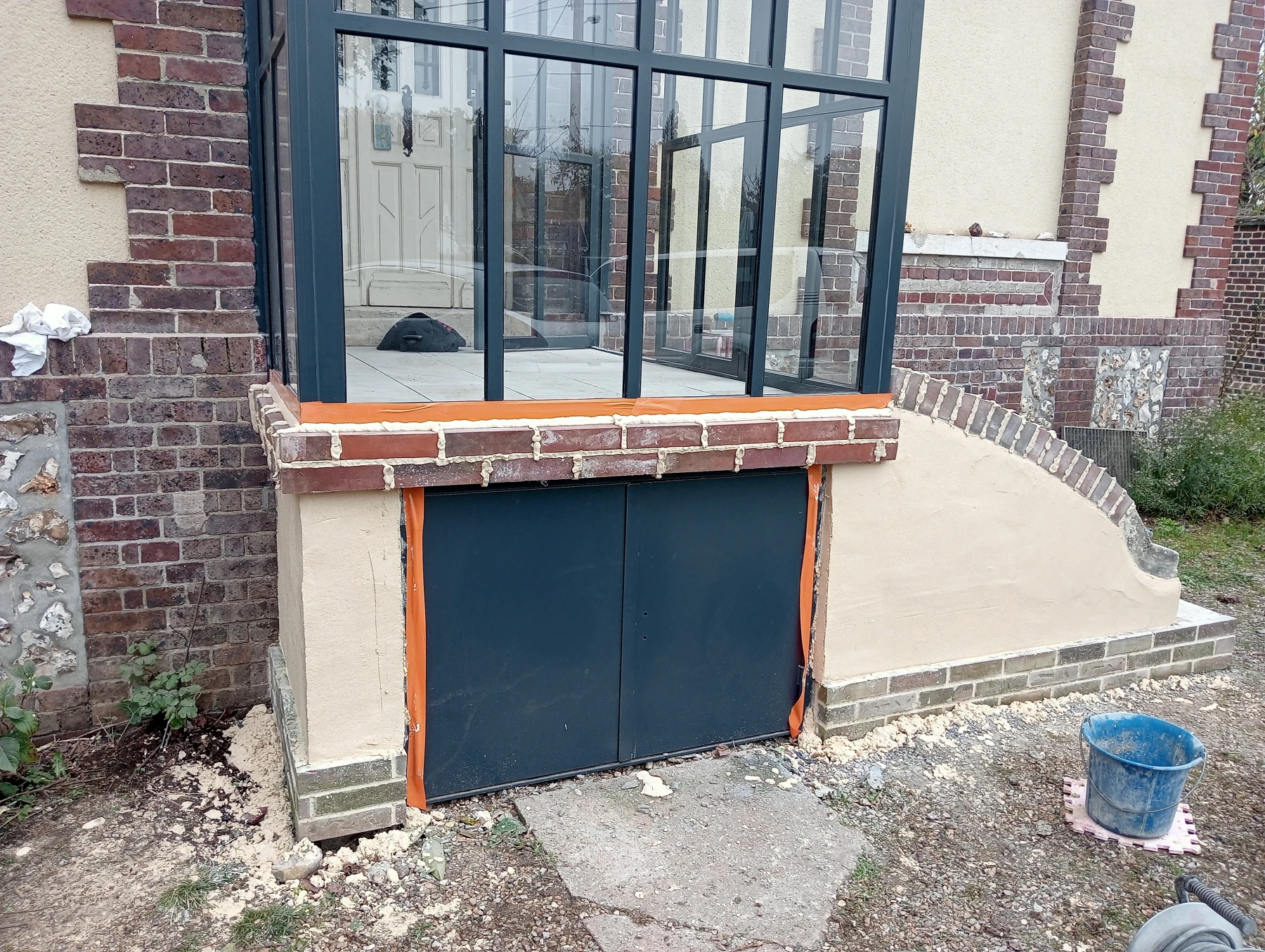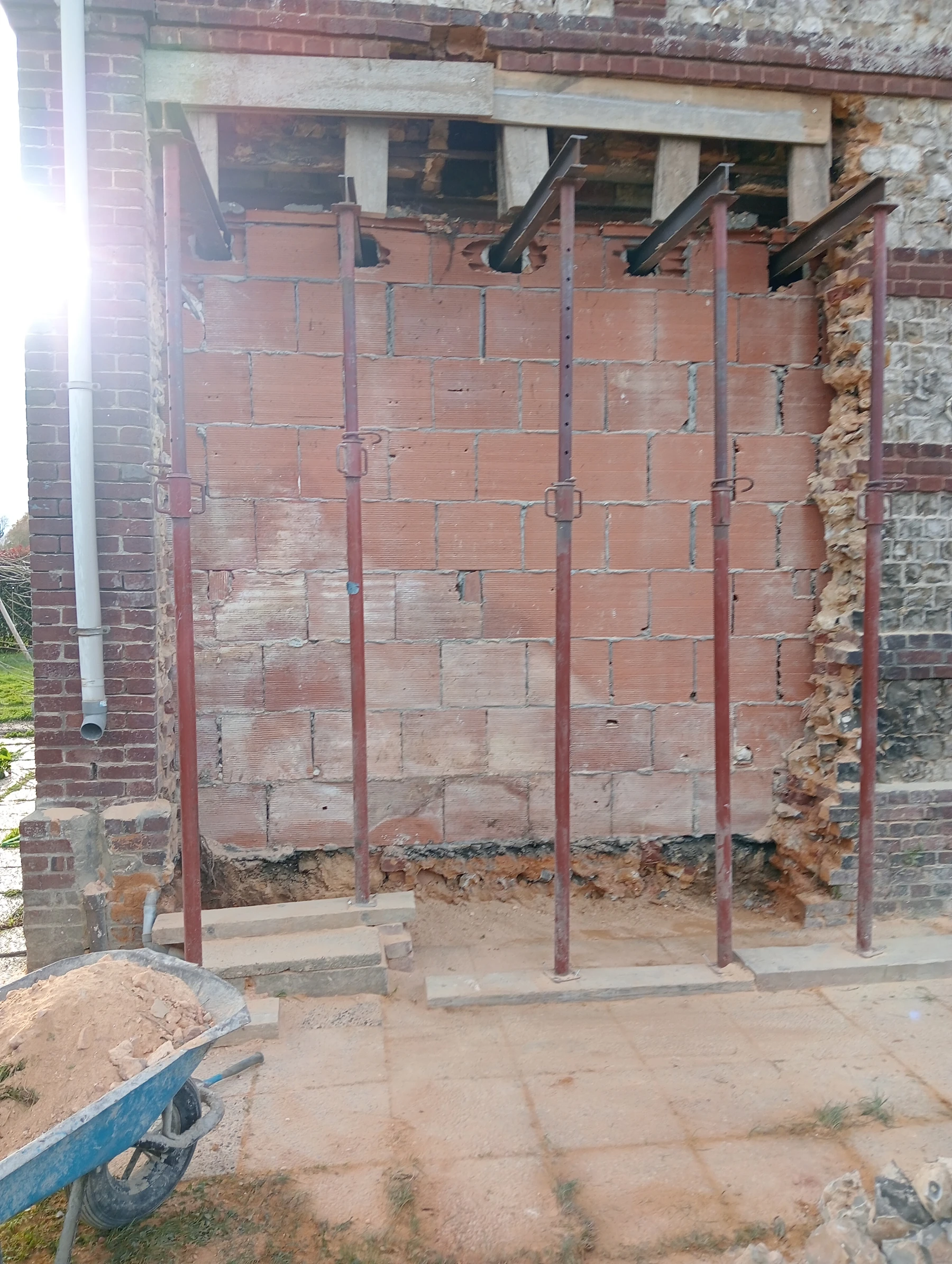 travaux de rénovation sur une façade en brique et silex