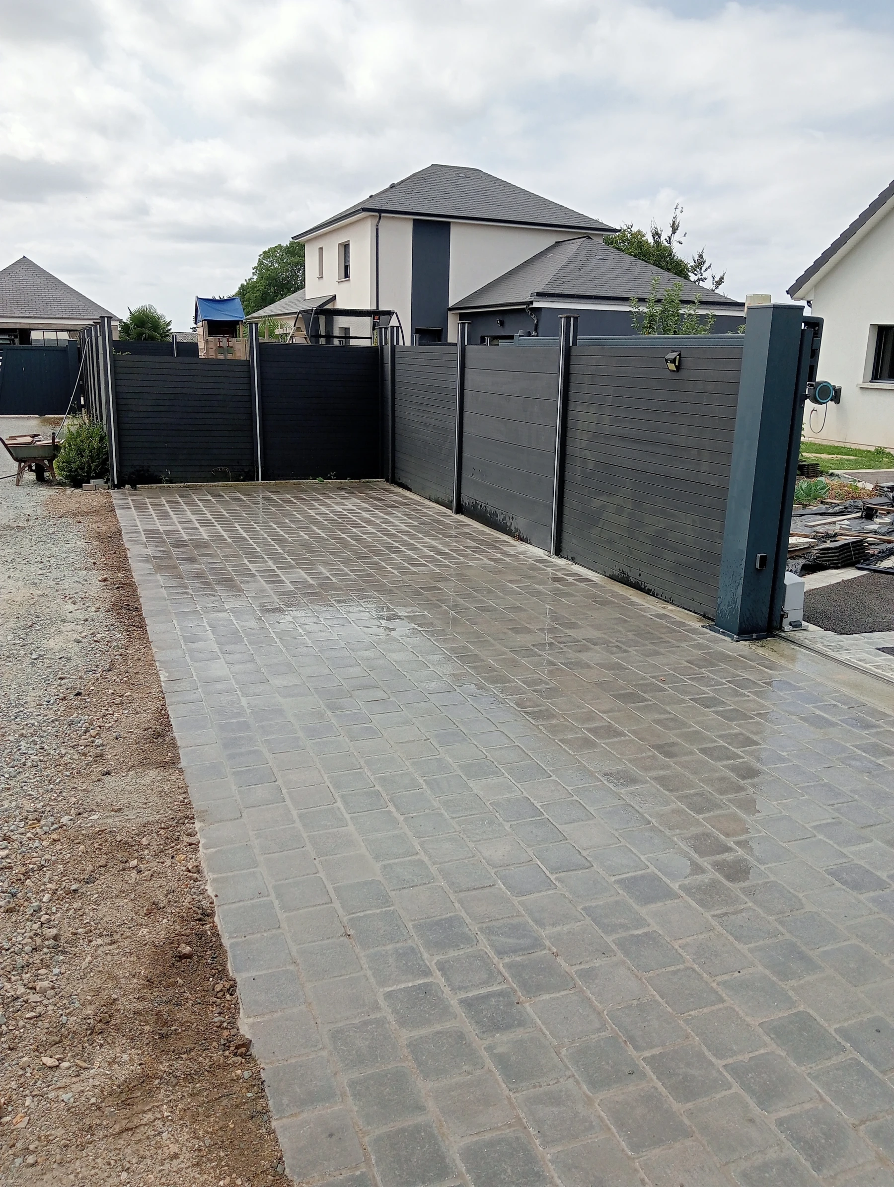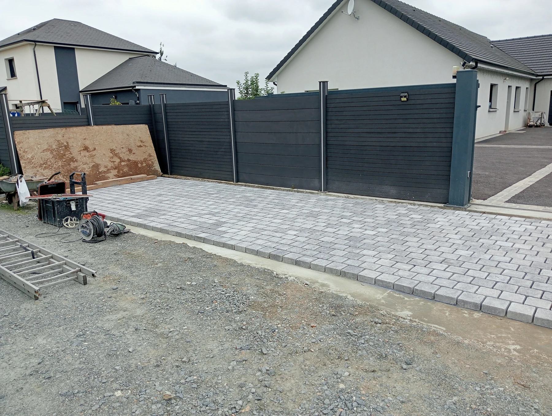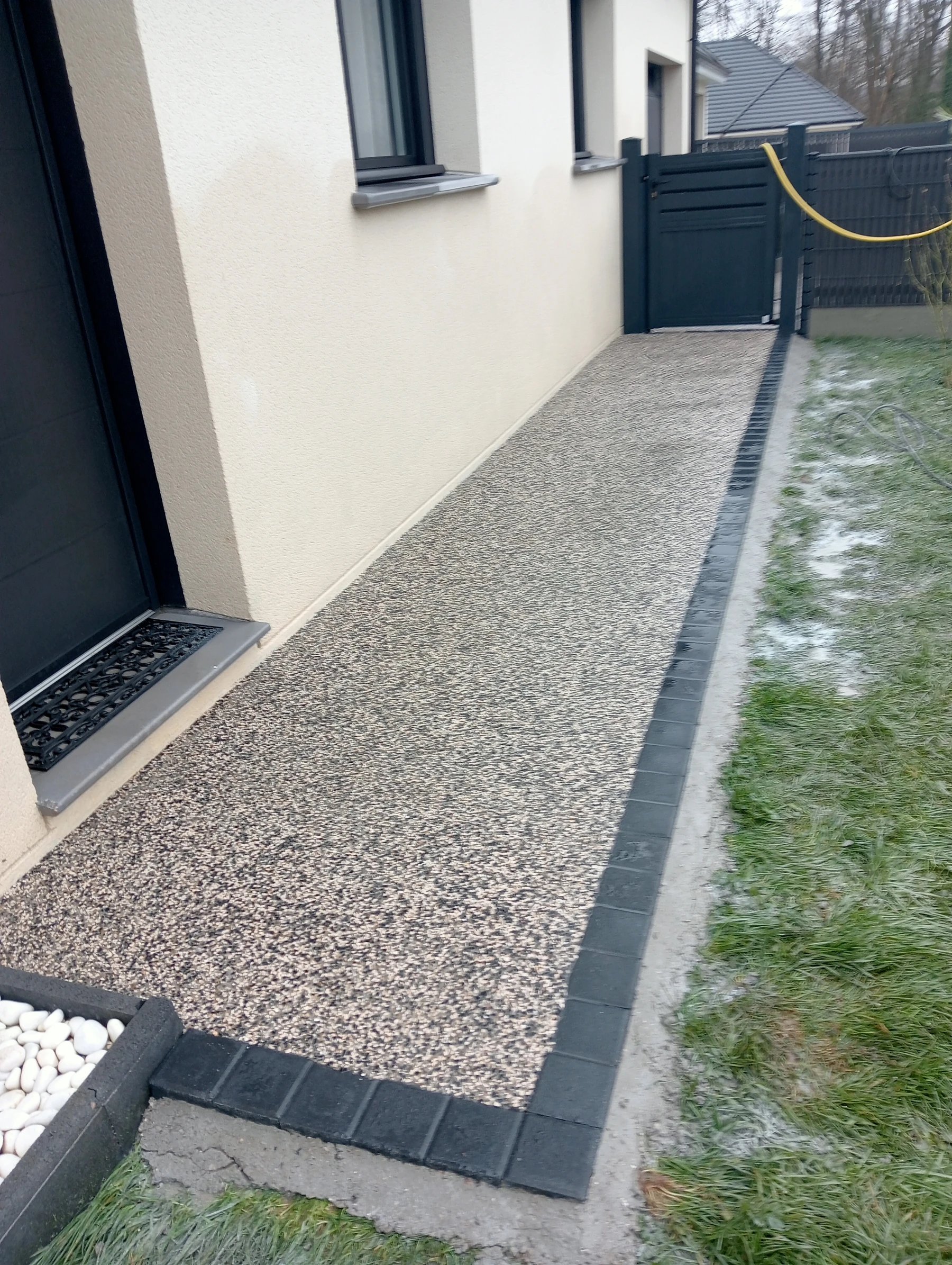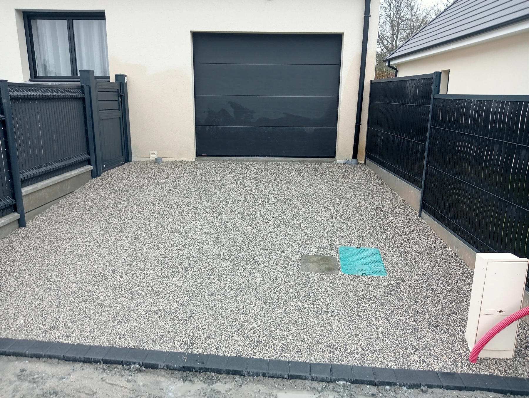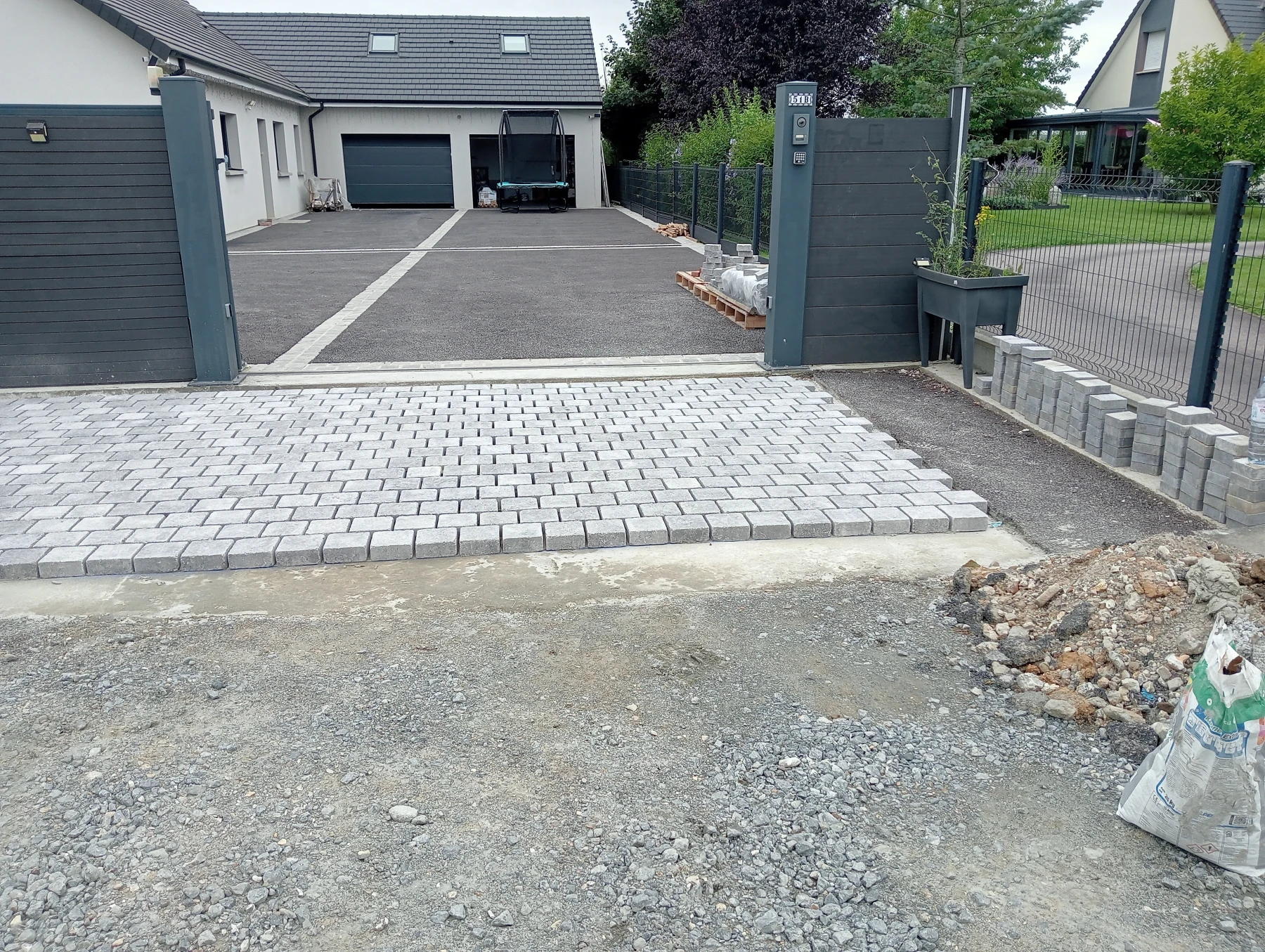 Aménagement extérieur en béton désactivé avec pose de pavé 12*12 Noir chantier Anceaumeville 76