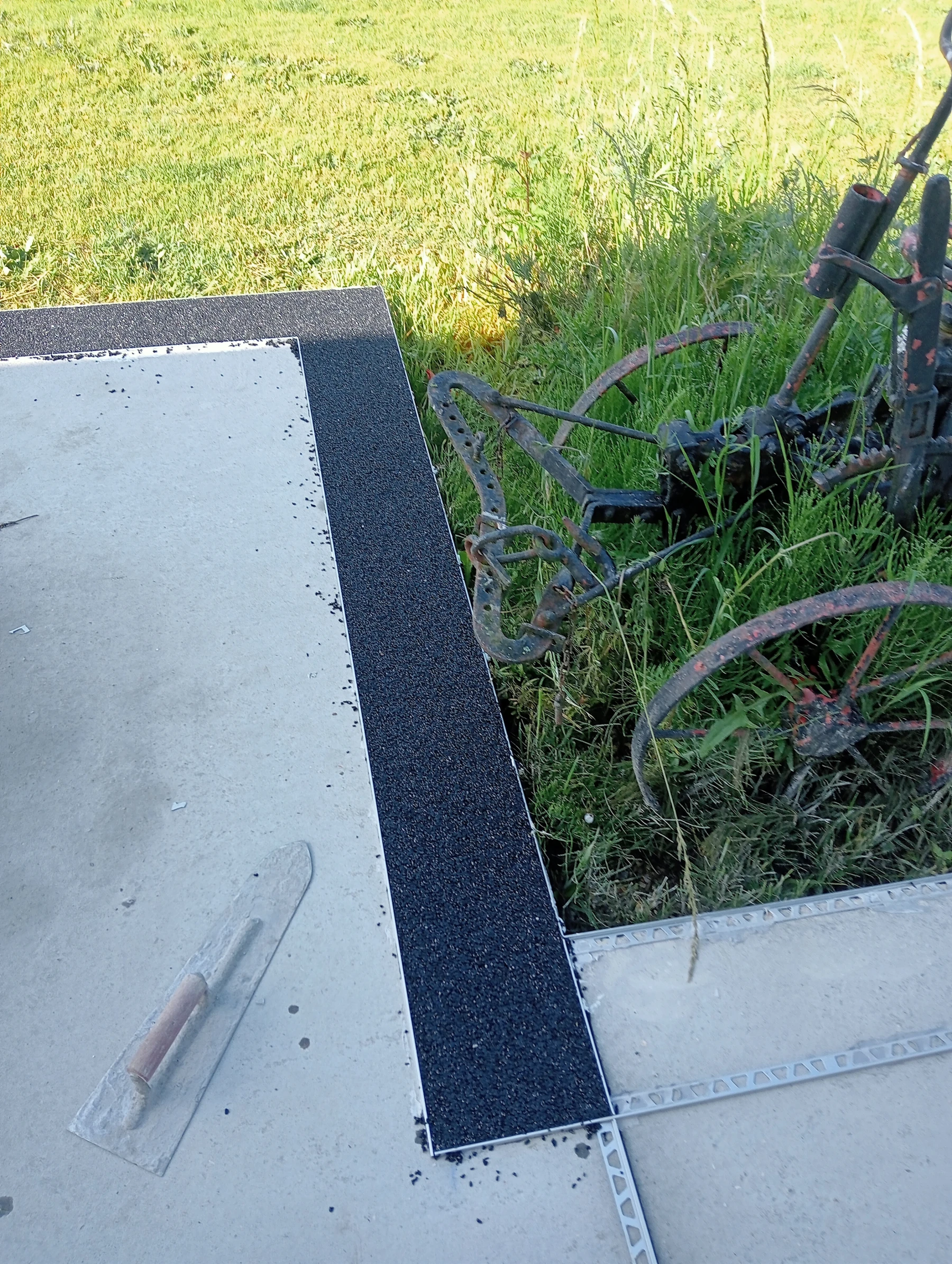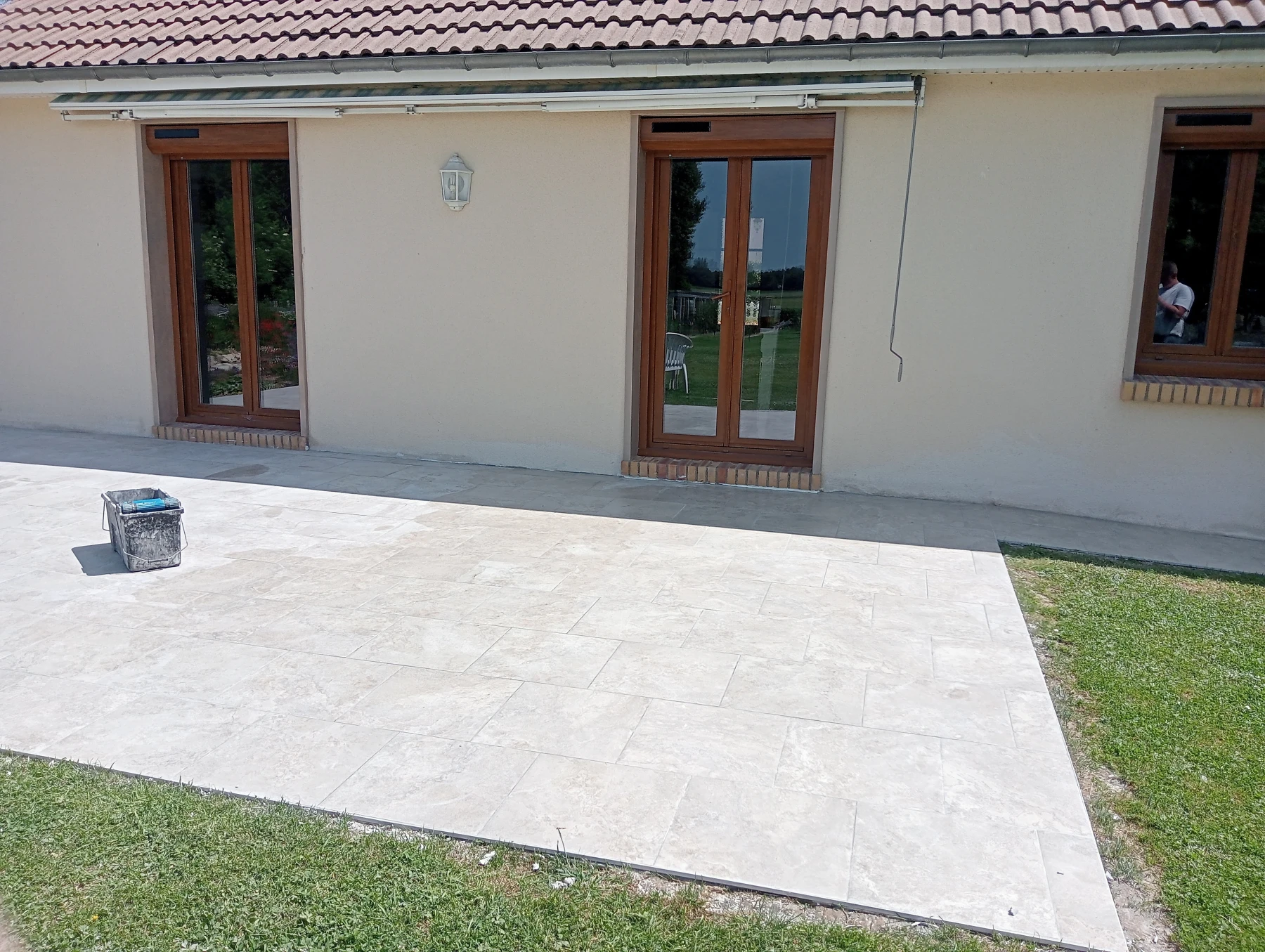 Pose d'un carrelage 45*45 sur terrasse en béton existant chantier sur sierville