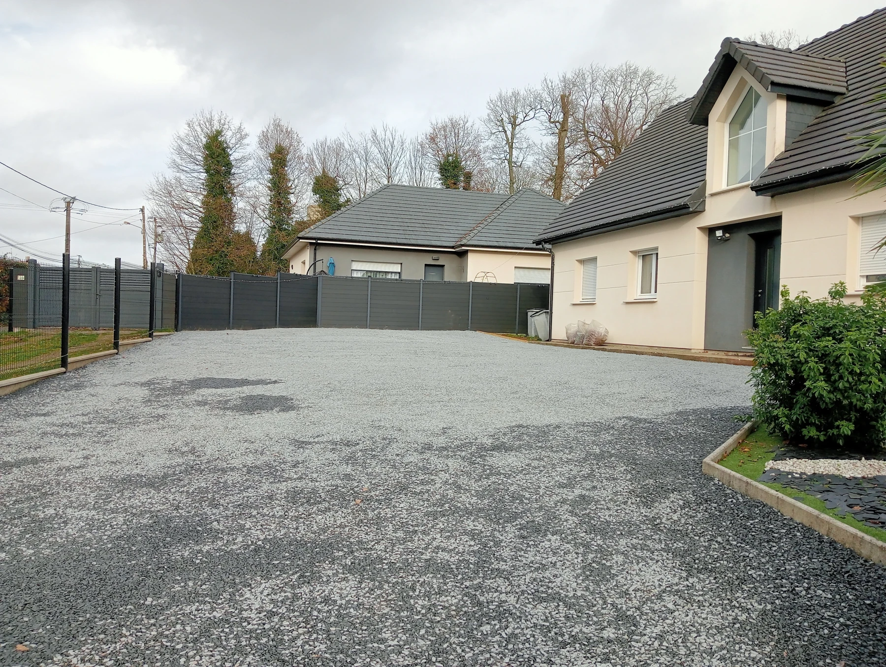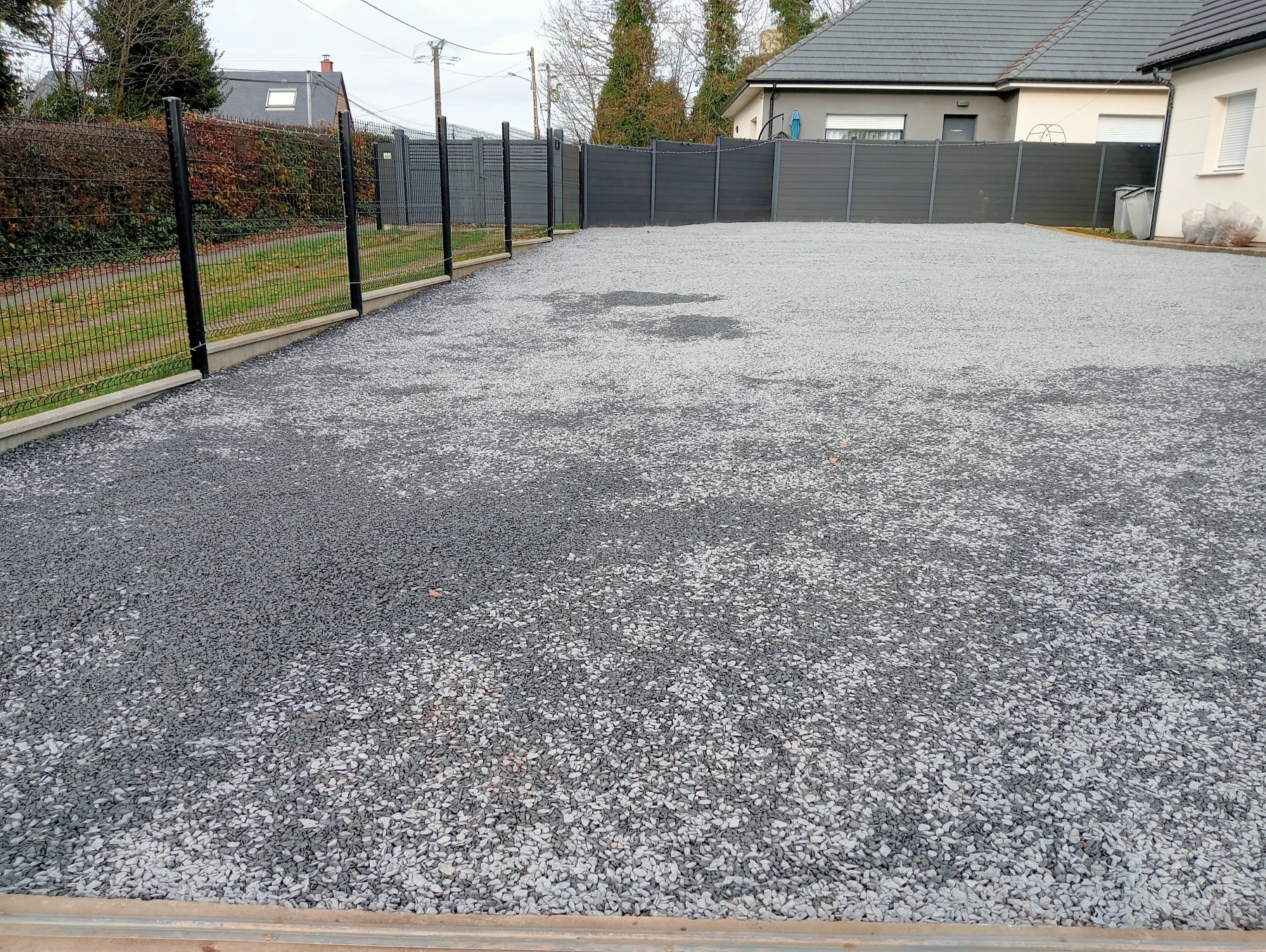 Aménagement d'un parking en gravier bleuté chantier sur Limésy